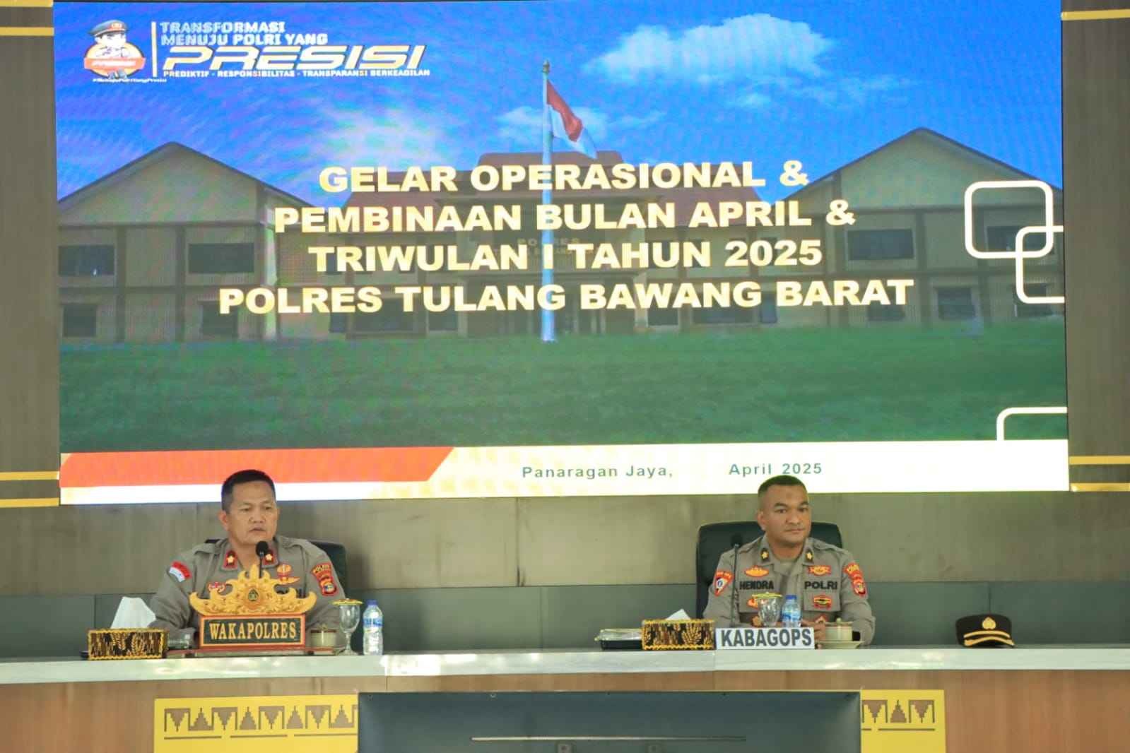 Tulang Bawang Barat,Kompas86.Com Wakapolres Tulang Bawang Barat Kompol Zaini Dahlan, S.H., M.H mewakili Kapolres Tubaba AKBP Sendi Antoni, S.I.K., M.I.K. didampingi Kabagops Kompol Hendra Gunawan, S.H., M.H. Pimpin Langsung pelaksanaan Gelar Operasional (GO) Bulanan Dan Anev Situasi Kamtibmas dan Pembinaan Bulan April 2025 di aula Sarja Arya Racana Mapolres Tubaba, Selasa (23/04/2025) Pagi