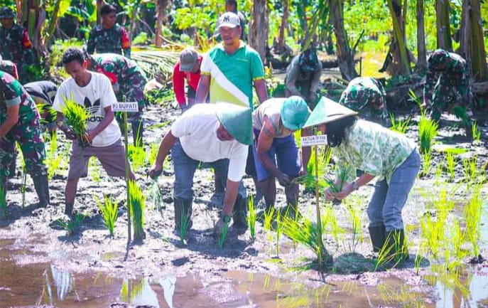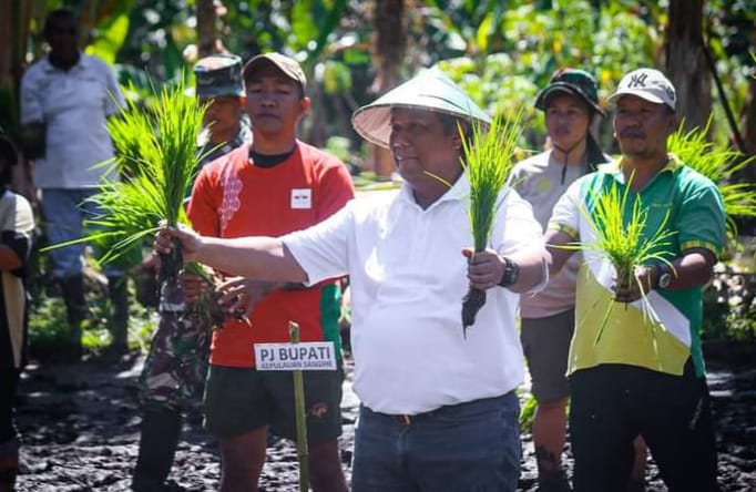 PJ. Bupati Kabupaten Kepulauan Sangihe Albert Huppy Wounde SH , MH melakukan penanaman padi di Kempaung Kalekube Kecamatan Tabukan Utara pada hari Rabu (21/08/2024)