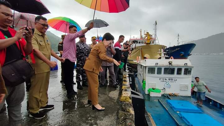 Penjabat Bupati Kabupaten Kepulauan Sangihe dr. Rinny Tamuntuan menyatakan resmi melakukan Ekspor Komoditi hasil Perikanan ke Kota Gensan, Filipina, pada Senin (29/01/24) di pelabuhan Nusantara Tahuna.