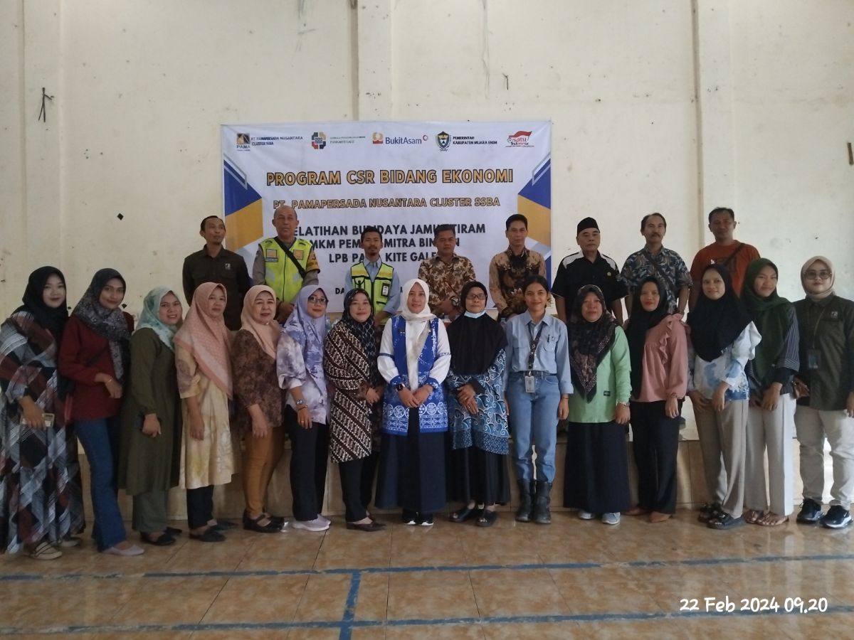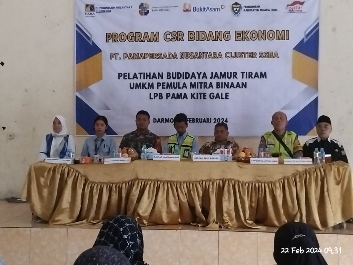 Muara Enim,SUMSEL,Kompas86.com// PT Pamapersada Nusantara Cluster Sumatera Selatan Bukit Asam (SSBA), kembali menggelontorkan program CSR bidang ekonomi dengan melaksanakan Pelatihan Budidaya Jamur Tiram pada UMKM pemula mitra binaan Lembaga Pengembangan Bisnis (LPB) Pama Kite Gale (Pakiga) yang dilaksanakan di Balai Serba Guna, Desa Darmo, Kecamatan Lawang Kidul, Kabupaten Muara Enim, Kamis (22/02/2024).