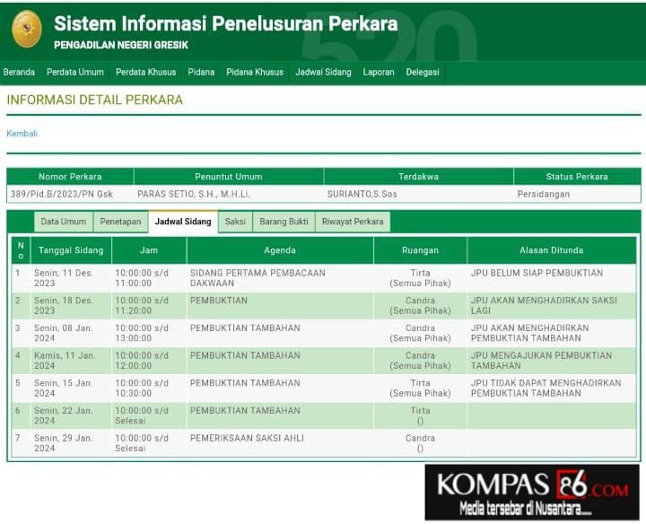 Kabar tersebut diperoleh dari Sistim Informasi Penelusuran Perkara (SIPP) Pengadilan Negeri (PN) Gresik yang terpublikasi pada Senin (22/1/2024).