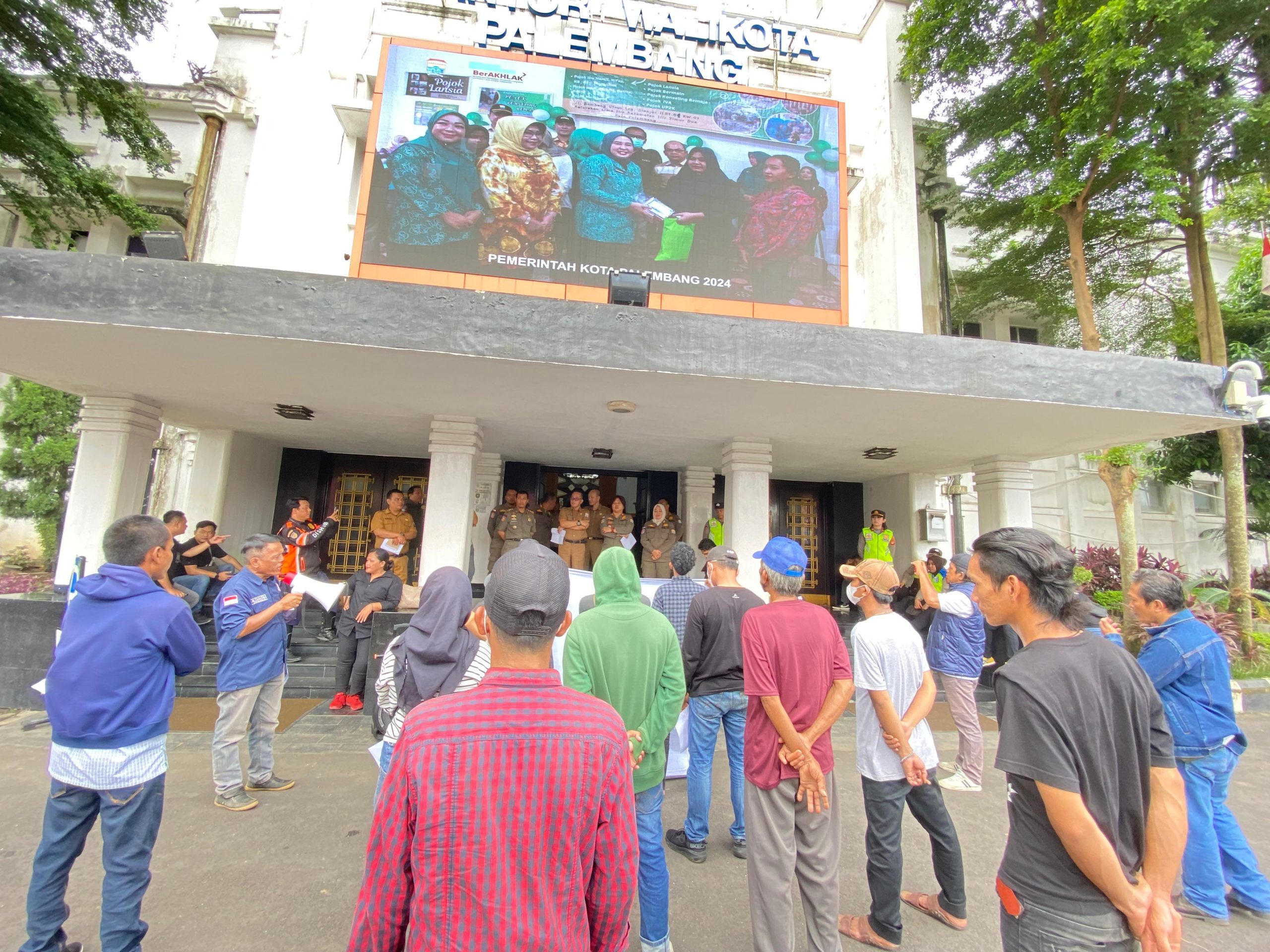 Palembang # Puluhan orang yang tergabung dalam Forum Masyarakat Tanjung Aur dan Tanjung Barangan Bersatu menggelar demo aksi damai di Kantor Walikota Palembang.