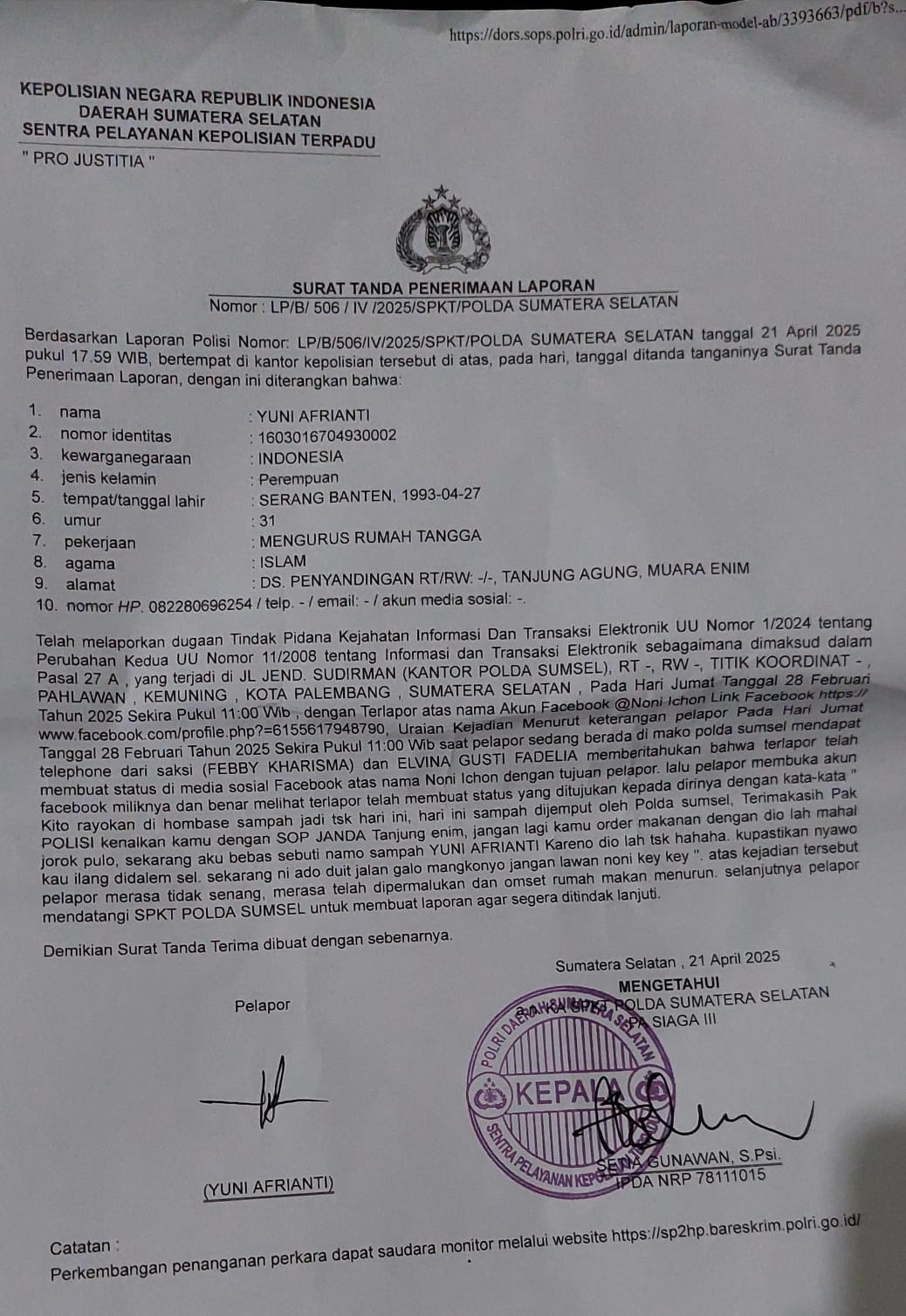 “Saya berharap Polda Sumsel khususnya Unit Cyber agar serius dalam menangani laporan ini dengan cepat tanggap, transparan dan tidak tebang pilih, karena dengan adanya masalah ini saya betul-betul sangat dirugikan,” ujar Yuni kepada wartawan, Sabtu (26/04/2025).
