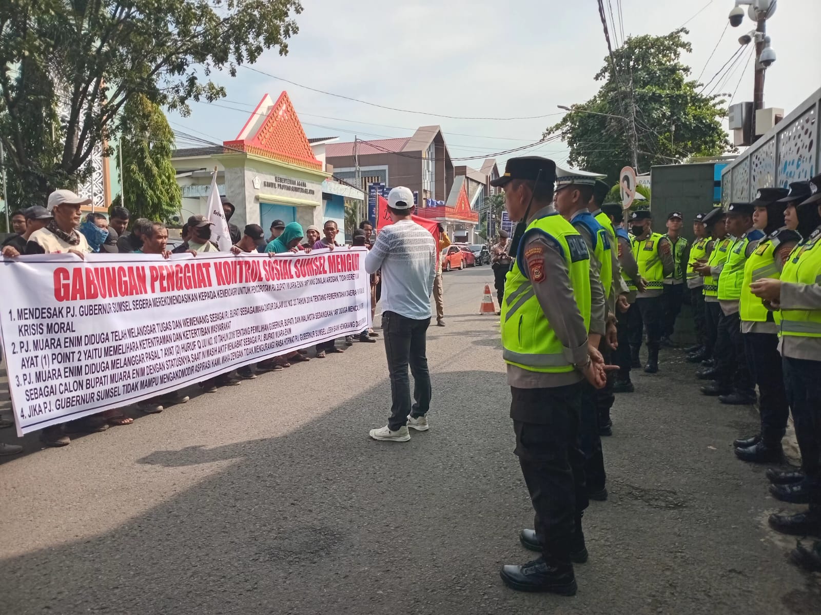 Palembang _ Gabungan Penggiat Kontrol Sosial Sumatera Selatan (Sumsel) menggelar demo aksi damai di Kantor Gubernur, Jl. Kapten A. Rivai No.3, Sungai Pangeran, Kec. Ilir Tim. I, Palembang. Dalam aksinya para pendemo meminta Pj Gubernur Sumsel segera copot Pj Bupati Muara Enim.