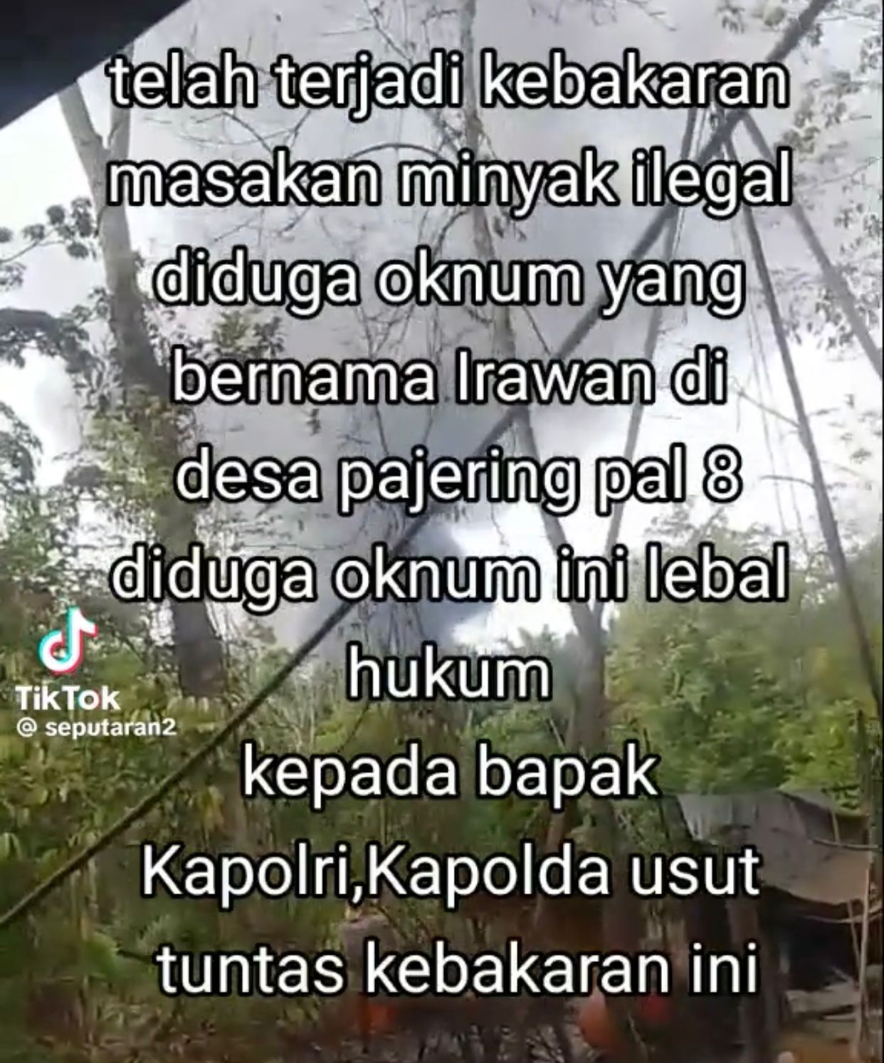 “Telah terjadi kebakaran masakan minyak ilegal diduga oknum yang bernama irawan didesa Pajering Pal 8 diduga oknum ini kebal hukum, Kepada Bapak Kapolri, Kapolda usut tuntas kebakaran ini,” tulisnya.