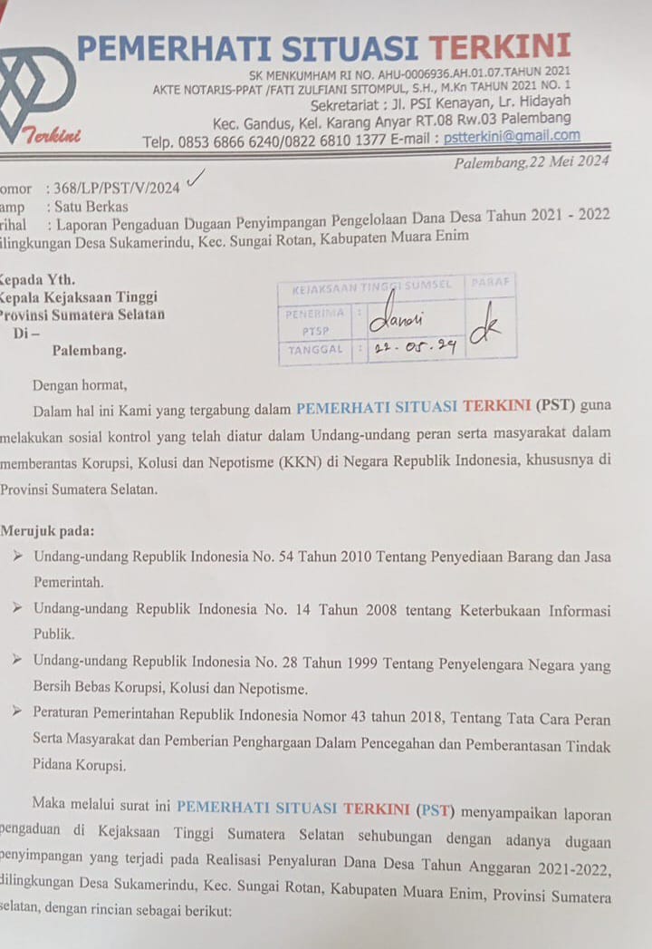 Palembang – Lembaga Pemerhati Situasi Terkini (PST) sampaikan Laporan Pengaduan (Lapdu) ke Kejaksaan Tinggi Sumatera Selatan (Kejati Sumsel) terkait adanya dugaan penyimpangan