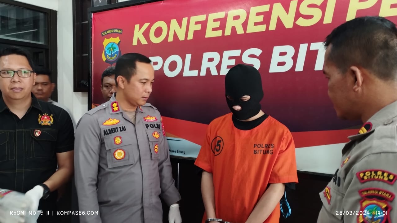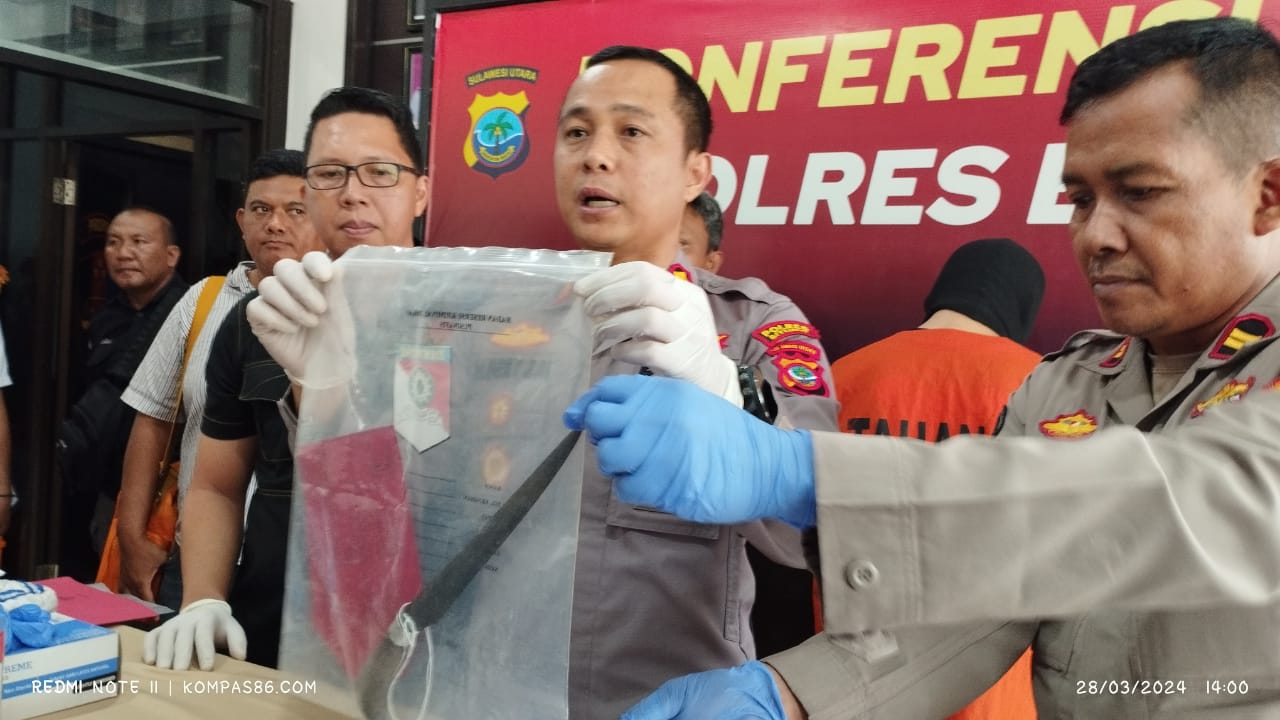 Kapolres Bitung AKBP Albert Zai S.I.K M.H dalam konferensi pers yang digelar di Polres Bitung, mengungkap motif kronologi atas pembunuhan yang terjadi di Pinangunian. Kamis 28/3/2024.