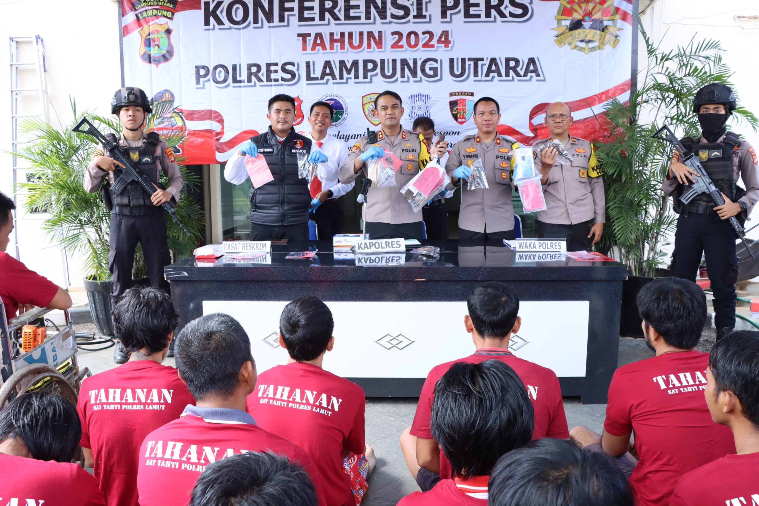 Lampung Utara,Kompas86.Com Dalam Operasi Sikat Krakatau 2024, Polres Lampung Utara menjadi rangking 1 di jajaran Polda Lampung atas capaian terbanyak mengungkap kasus kejahatan dengan mengungkap 54 kasus dengan mengamankan 57 orang tersangka.