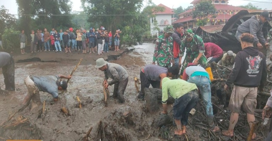 Danrem 032/Wbr Brigjen.TNI.Rayen Obersyl di dampinggi oleh Dandim 0304 Agam, Letkol.Arm.Bayu Ardhiyta Nugroho.SH.M.Han, meninjau langsung lokasi banjir lahar dingin Batang Aia Kasiak, Jorong Kubang Duo, Nagari Bukik Batabuah, Kecamatan Canduang Kabupatrn Agam, 06/04/24