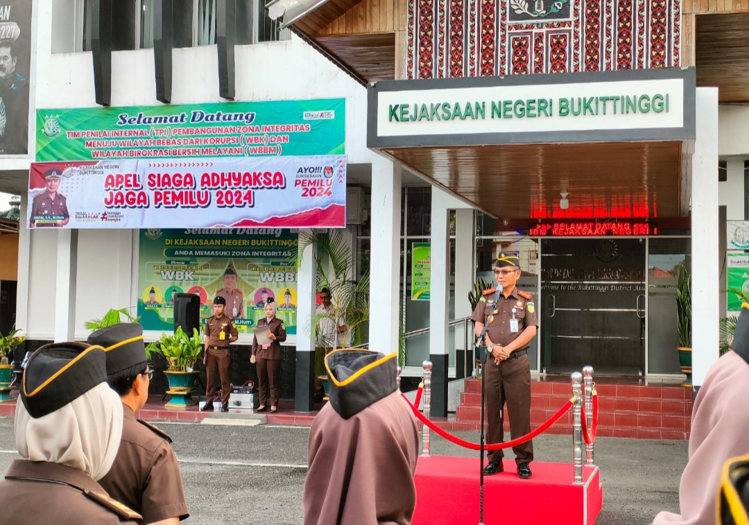 Apel Siaga Adhyaksa Jaga Pemilu 2024 dilaksanakan dalam rangka kesiapan dan partisipasi Kejaksaan menghadapi Pemilihan Umum tahun 2024 yang dilakukan secara serentak di seluruh Indonesia agar berjalan dengan sukses, aman, lancar dan tertib sesuai dengan peraturan yang berlaku, khususnya di wilayah hukum Kejaksaan Negeri Bukittinggi