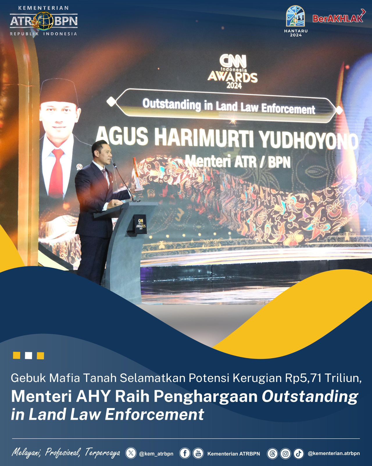 Surabaya,Kompas86.com – Menteri Agraria dan Tata Ruang/Kepala Badan Pertanahan Nasional (ATR/BPN), Agus Harimurti Yudhoyono (AHY) menerima penghargaan atas sinergi dan kolaborasi yang dilakukan dalam pemberantasan mafia tanah bersama kepolisian, kejaksaan, dan pemerintah daerah. Penghargaan _Outstanding in Land Law Enforcement_ ia terima dalam CNN Indonesia Awards 2024, Rabu (25/09/2024).