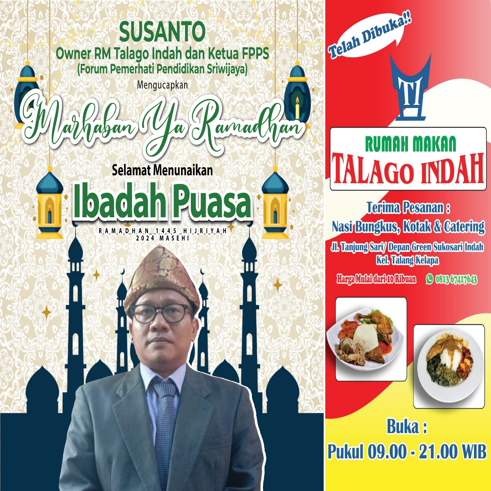 “Satu hal lagi, kami menyediakan layanan pesan antar dengan cara, para pelanggan bisa menghubungi kenomor telpon atau Whatsapp : 081367417643,” pungkas Susanto yang dikenal sebagai Ketua Forum Pemerhati Pendidikan Sriwijaya Sumsel (FPPSS) tersebut.