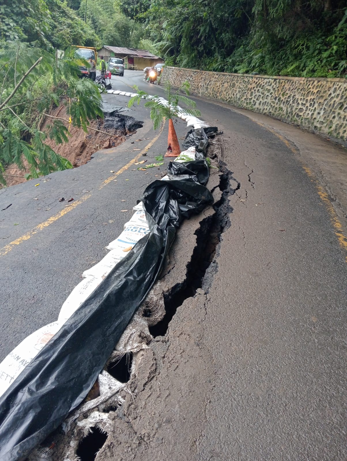 Kerusakan jalan nasional ini karena curah hujan beberapa hari lalu yang curah hujan tinggi sehingga membuat jalan rusak dan longsor.