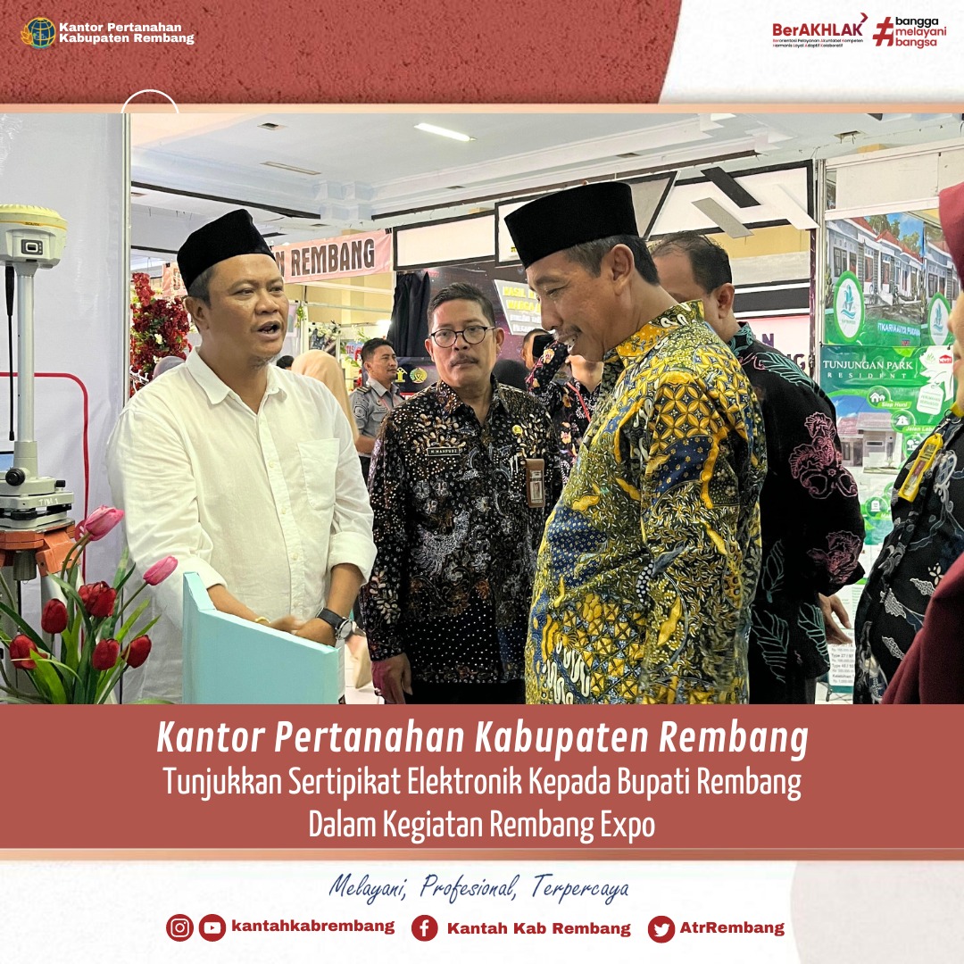 Bupati Rembang berkunjung ke beberapa stand yang ada di Expo, salah satunya stand Kantor Pertanahan Kabupaten Rembang. Dalam hal ini, Kantor Pertanahan Kabupaten Rembang menampilkan Sertipikat Elektronik yang telah dicetak dan juga produk-produk Akses Reforma Agraria.