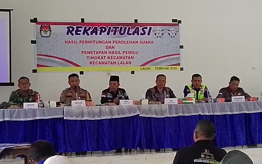 Kapolsek Lalan Iptu Zulkarnain Afianata, ST, M.Si, MH pimpin pengamanan Rapat Pleno Rekapitulasi surat suara pemilihan umum 2024 tingkat kecamatan Lalan dalam pemilihan umum tahun 2024. Minggu (18/02/2024) sekira pukul 09.30 Wib.