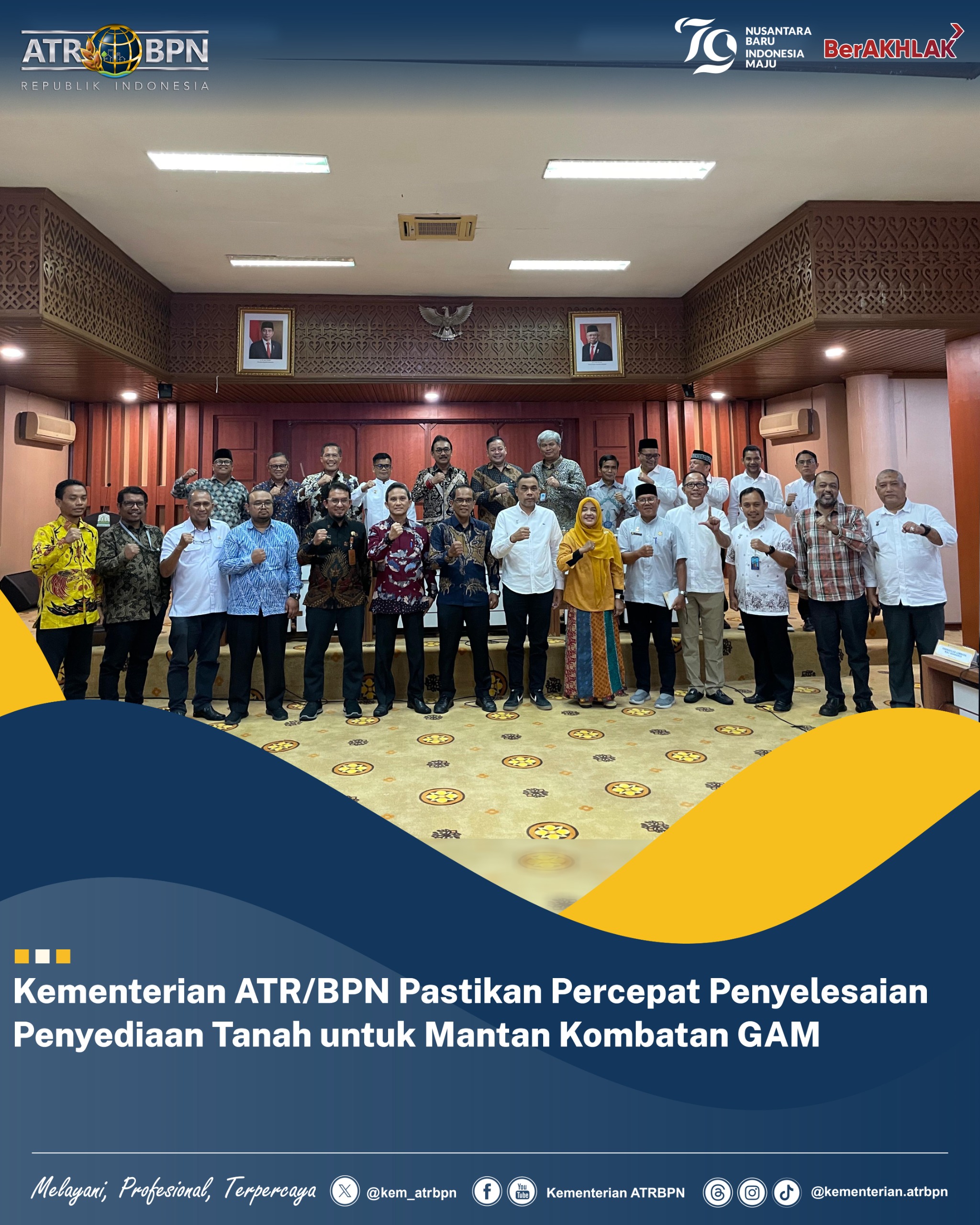Kementerian Agraria dan Tata Ruang/Badan Pertanahan Nasional (ATR/BPN) bersama Pemerintah Provinsi Aceh melakukan Rapat Koordinasi untuk membahas mengenai penyelesaian penyediaan tahan bagi Mantan Kombatan Gerakan Aceh Merdeka (GAM). Rapat koordinasi ini berlangsung di Kantor Gubernur Aceh, pada Jumat (12/07/2024).