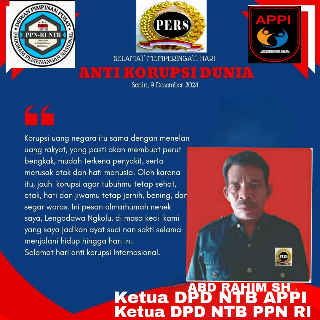 Bima NTB kompas86.com.Ketua Dewan Pimpinan Daerah provinsi NTB PPN RI ABD RAHIM ( DPD provinsi NTB PPN RI) dan Kaperwil NTB media kompas86.com. Mengucapkan selamat Hari Anti Korupsi Sedunia (HAKORDIA) yang diperingati pada tanggal 9 Desember 2024 setiap tahunnya. Selasa (10/12/2024).