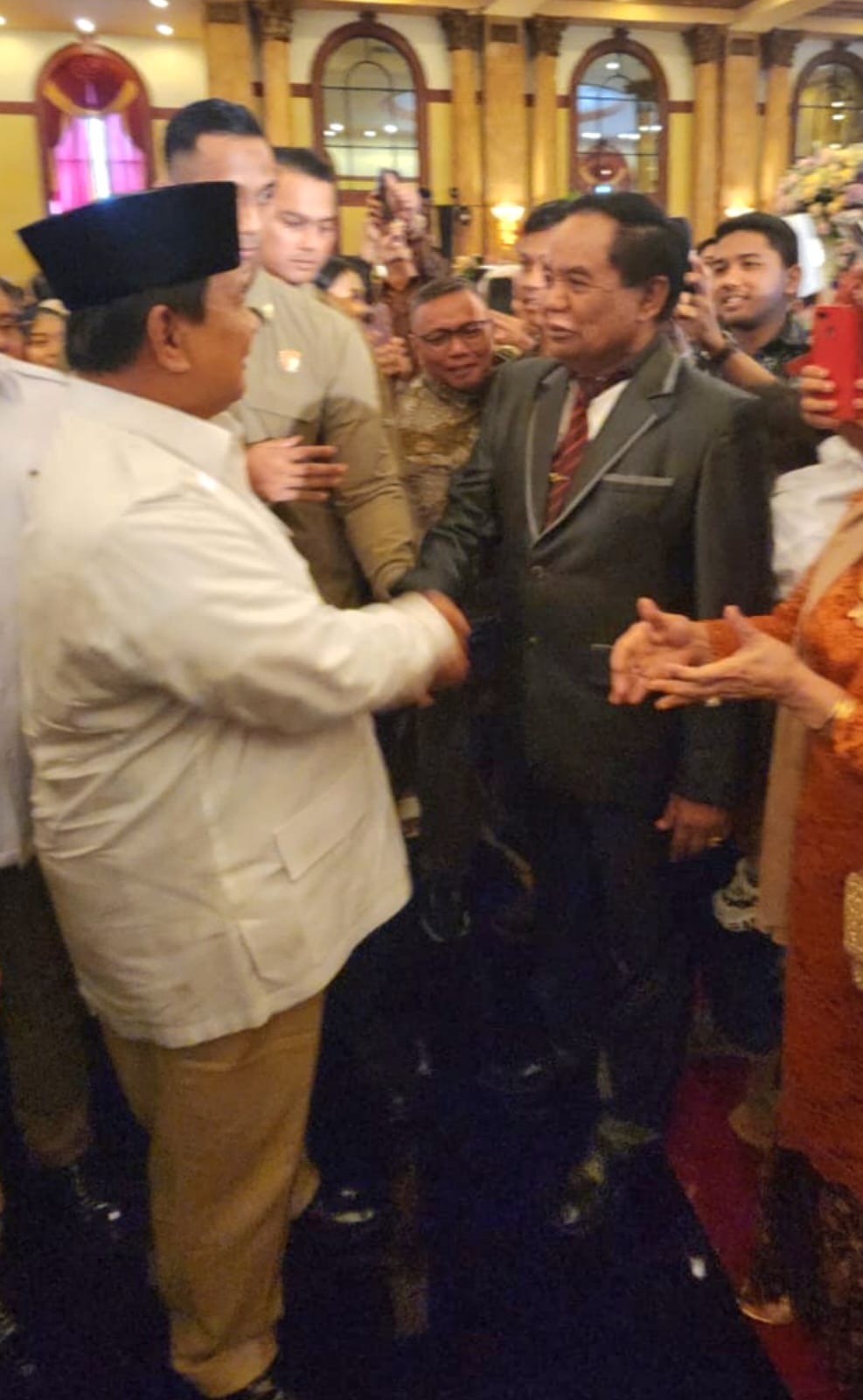 Keakraban terlihat dari senyuman dan sapaan Presiden RI Jenderal Purn Prabowo Subianto terhadap Tatang Zaenudin saat menghadiri undangan pernikahan putra dari Letjen TNI Djaka Budhi Utama di balai samudera kelapa gading Jakarta, Sabtu (15/2/2025).