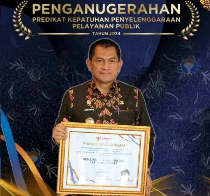 Lampung Utara,Kompas86.Com Pemerintah Kabupaten Lampung Utara kembali menorehkan prestasi gemilang dengan meraih penghargaan Predikat Kepatuhan Penyelenggaraan Pelayanan Publik dari Ombudsman Republik Indonesia. Penghargaan ini diberikan dalam acara penganugerahan yang digelar di Aula Hotel Emersia, Bandar Lampung pada Kamis, 12 Desember 2024.