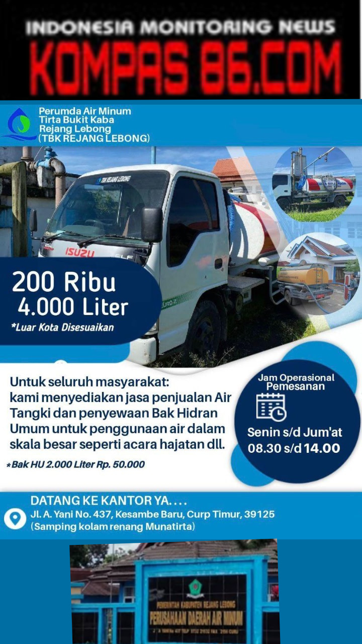 Rejang Lebong ( Bengkulu ) Kompas86.com Untuk Seluruh Masyarakat kabupaten Rejang Lebong, Perumda Air minum Tirta Bukit kaba Telah membentuk tim khusus yang bertugas melayani kepentingan pelanggan Untuk Masyarakat kabupaten Rejang Lebong Agar Bisa menikmati jasa pelayanan air bersih dari PDAM tirta bukit kaba Menyediakan penjualan air tangki dan menyewakan Bak Hidran.