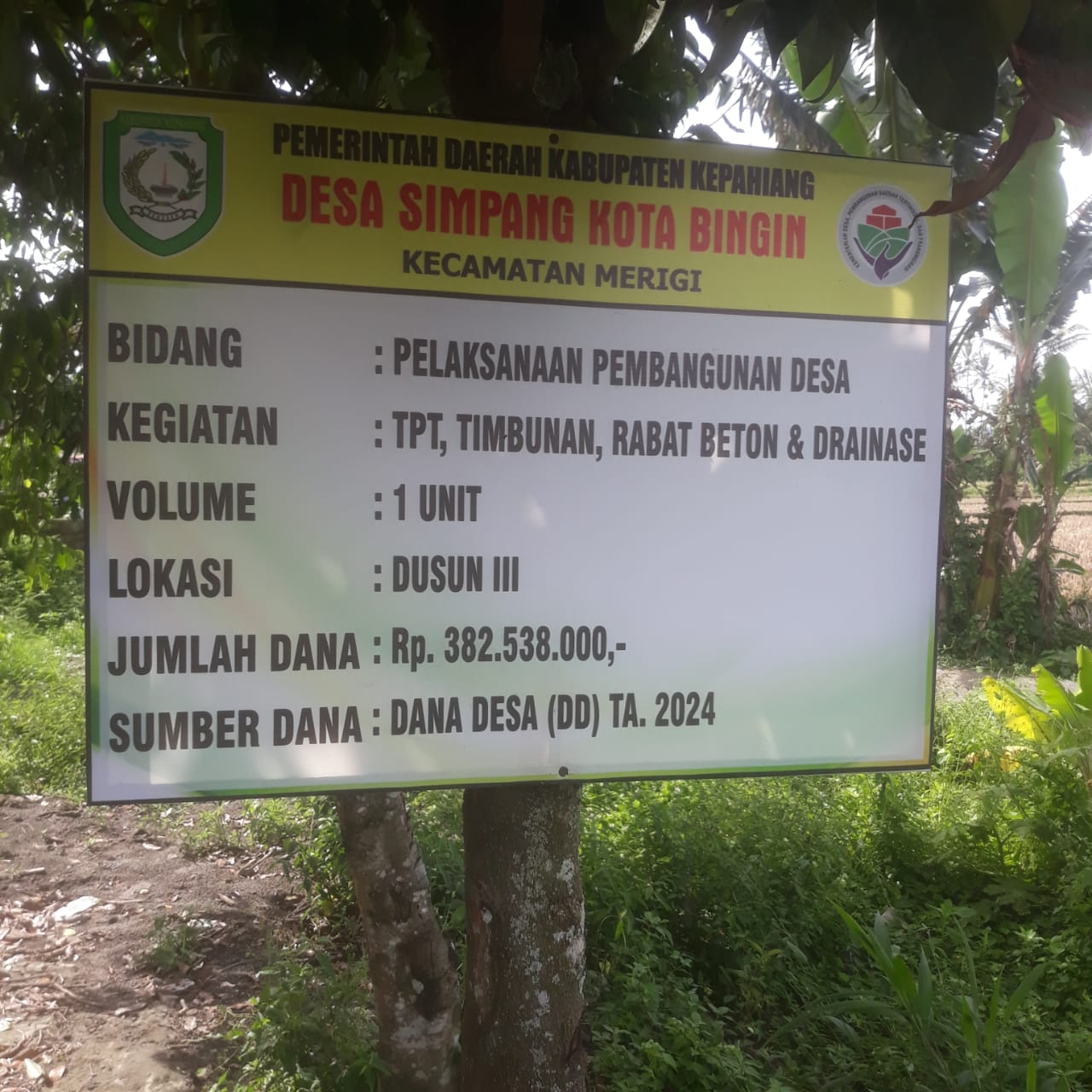 Kepahiang ( Bengkulu ) Pelaksanaan Bidang Pembangunan Desa Pada kegiatan TPT, Timbunan, Rabat Beton dan Drainase di desa Simpang Kota Beringin dusun 3 Kecamatan Merigi Kabupaten Kepahiang yang menggunakan anggaran Dana Desa (DD) Tahun 2024 senilai RP 382.538.000, terkesan di mark-up.