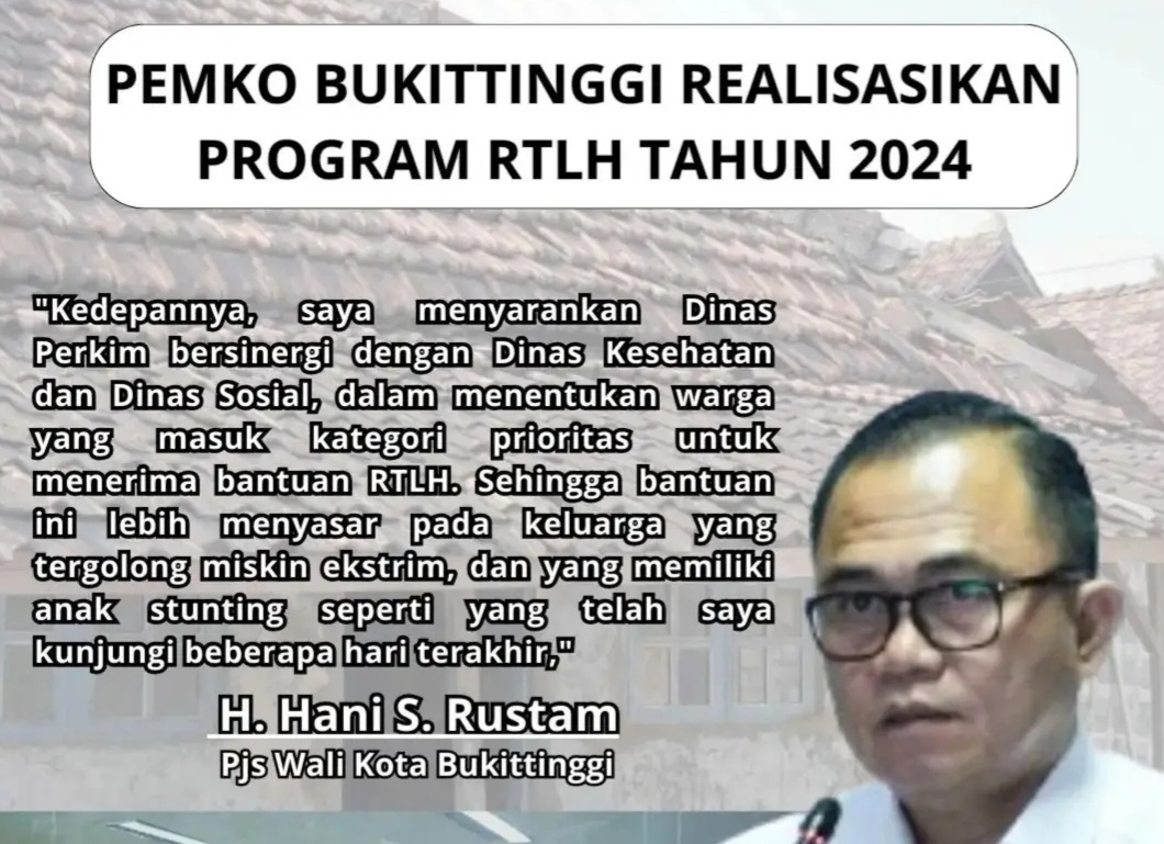 Pjs Wali Kota Bukittinggi, H. Hani Syopiar Rustam, mengapresiasi atas terealisasinya program RTLH tahun 2024 ini. Ia mengingatkan kepada Dinas Perkim Kota Bukittinggi untuk melakukan pengecekan ulang terhadap kepemilikan rumah yang telah diajukan. Pengecekan dilakukan untuk memastikan bahwa bantuan rumah tidak layak huni benar-benar diberikan kepada warga yang membutuhkan dan sesuai dengan data serta aturan yang berlaku.