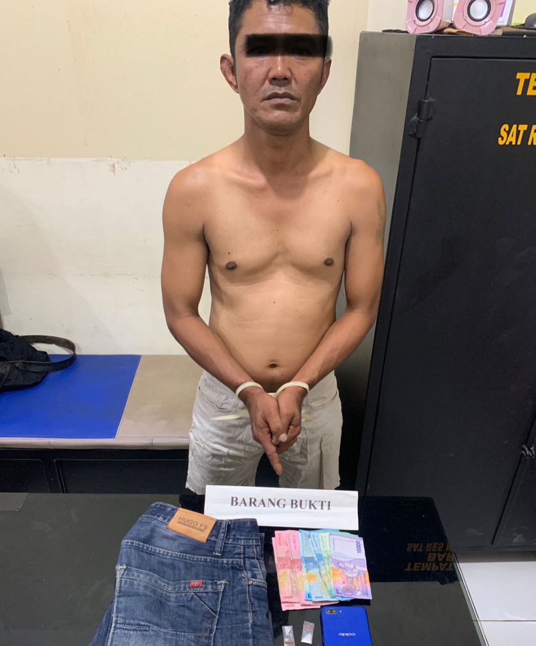 selanjutnya dilakukan penggeledahan badan ditemukan 1 (satu) buah hp merek oppo warna biru di dalam saku depan sebelah kiri tersangka dan di temukan uang sejumlah Rp. 750.000 (tujuh ratus lima puluh ribu rupiah) di dalam saku belakang sebelah kanan tersangka, dengan pecahan Rp. 100.000 -, sebanyak lima lembar dengan nomor seri HQM159313,NHU119785,MHQ361260,LQU678616,WKA359474,pecahan Rp.50,000 -, sebanyak empat lembar dengan nomor seri WCM311436,KDU858619,SCH780464,BRU419758, pecahan Rp. 20.000 -, sebanyak dua lembar dengan nomor seri ACK338578,ACV351911, dan pecahan Rp. 10.000 -,sebanyak 1 lembar dengan nomor seri BCH717596.