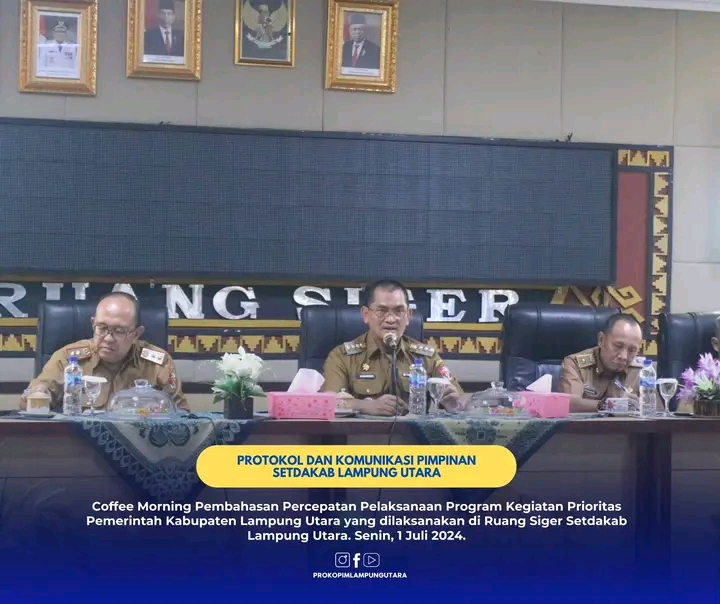 Lampung utara,Kompas86.Com Pj.Bupati Lampung Utara, Drs. H. Aswarodi, M.Si., menghadiri Coffee Morning Pembahasan Percepatan Pelaksanaan Program Kegiatan Prioritas Pemerintah Kabupaten Lampung Utara. Acara tersebut dilaksanakan di Ruang Siger Setdakab Lampung Utara pada hari Senin, 1 Juli 2024.