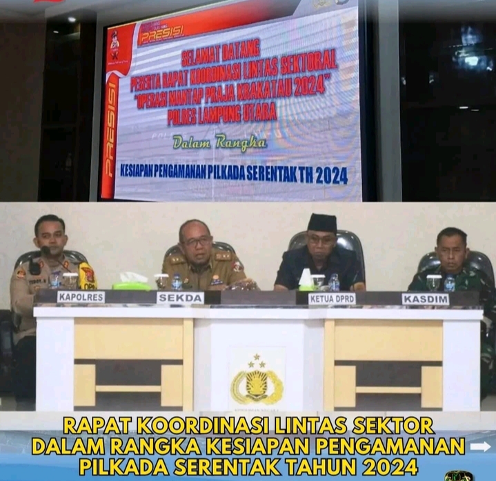 Lampung utara,Kompas86.Com Pj.Bupati Lampung Utara, yang diwakili oleh Sekretaris Daerah Kabupaten Drs. Lekok, M.M., menghadiri Rapat Koordinasi Lintas Sektoral dalam rangka Operasi Mantap Praja Krakatau 2024, yang bertujuan untuk mempersiapkan pengamanan Pilkada Serentak Tahun 2024. Rakor tersebut dilaksanakan di Aula Mapolresta Lampung Utara pada Selasa, 27 Agustus 2024.