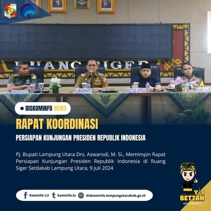 Kotabumi,Kompas86.Com Lampung Utara – Pj. Bupati Lampung Utara Drs. H. Aswarodi, M. Si didampingi Forkopimda Kabupaten Lampung Utara memimpin Rapat Persiapan Kunjungan Presiden Republik Indonesia ke Kabupaten Lampung Utara di Ruang Siger Setdakab. Lampung Utara. Selasa, 9 Juli 2024.