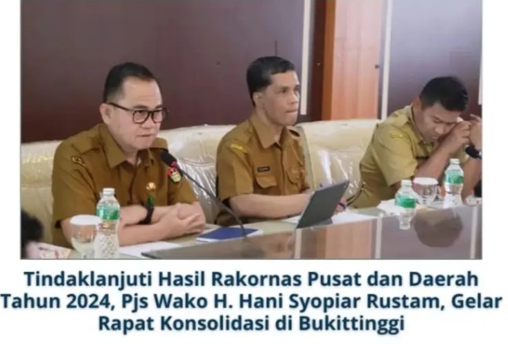 Bukittinggi, KOMPAS86.com — Tindaklanjuti hasil rakornas pemerintah pusat dan daerah tahun 2024, di Sentul, Bogor, Pjs Wali Kota Bukittingi, H. Hani Syopiar Rustam, gelar rapat konsolidasi internal bersama seluruh Kepala SKPD di lingkungan Pemerintah Kota Bukittinggi. Rapat dilaksanakan di Balaikota, Senin 11 Oktober 2024.