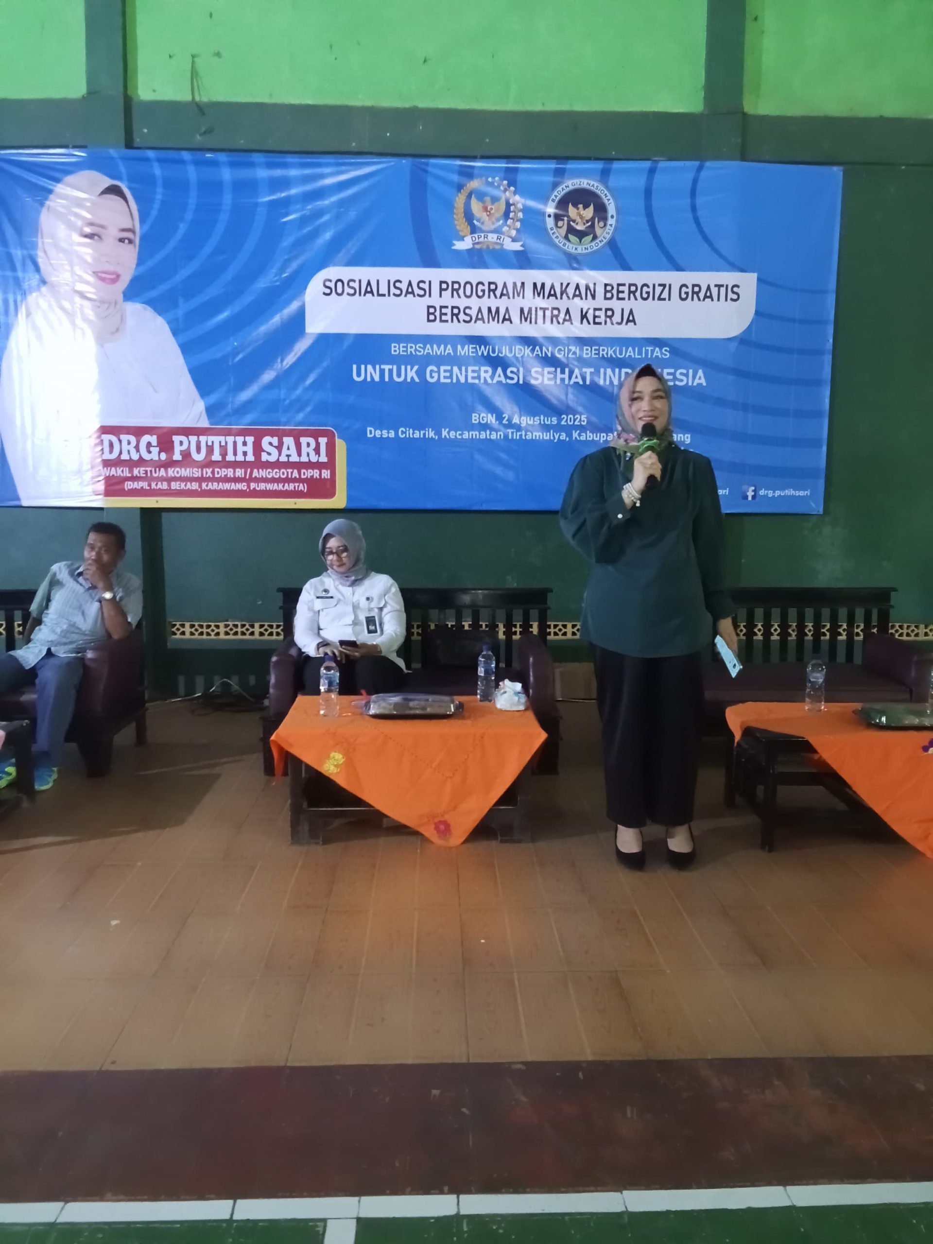 KOMPAS86.COM | KARAWANG – Wakil Ketua Komisi IX DPR RI, Drg. Putih Sari, mensosialisasikan Program Makan Bergizi Gratis bersama mitra kerja Badan Gizi Nasional (BGN). Acara ini berlangsung di Aula SMPN 1 Tirtamulya, Kecamatan Tirtamulya, Kabupaten Karawang, Sabtu (2/8/2025).