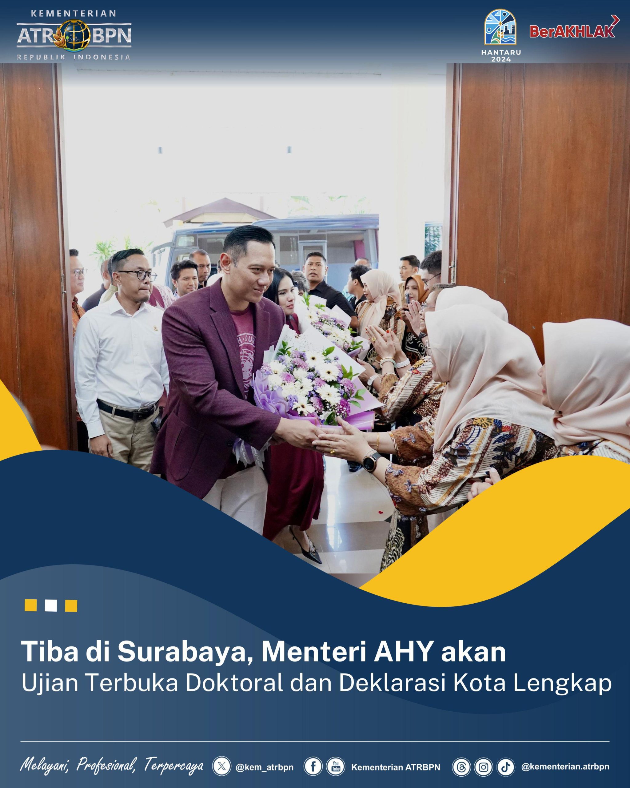 Surabaya,Kompas86.com – Menteri Agraria dan Tata Ruang/Kepala Badan Pertanahan Nasional (ATR/BPN), Agus Harimurti Yudhoyono (AHY) tiba di Surabaya, Jawa Timur pada Minggu (06/10/2024). Dalam kunjungannya kali ini, Menteri AHY akan menyelesaikan studi doktoralnya dengan mengikuti Ujian Doktor Terbuka pada Program Studi Pengembangan Sumber Daya Manusia, Sekolah Pascasarjana Universitas Airlangga.