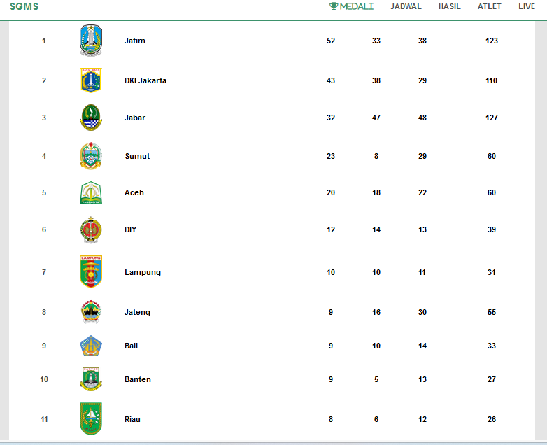 Selanjutnya di posisi kedua ada DKI Jakarta yang terus mengejar dengan penuh semangat. Total 108 medali yang sudah di dapat, 42 emas, 38 perak dan 28 perunggu. Tim ibukota itu menunjukkan kekuatan luar biasa di cabang renang dan bulu tangkis, menambah pundi-pundi emasnya dengan strategi yang cerdas.