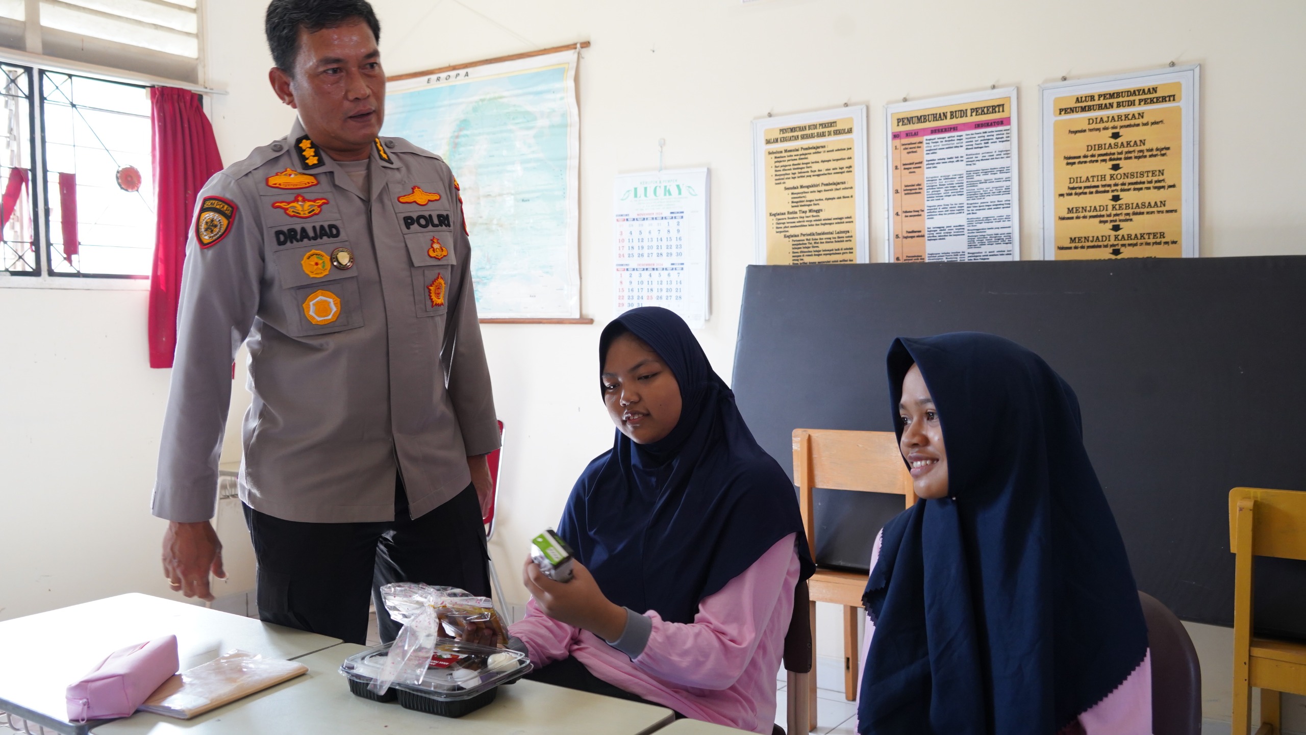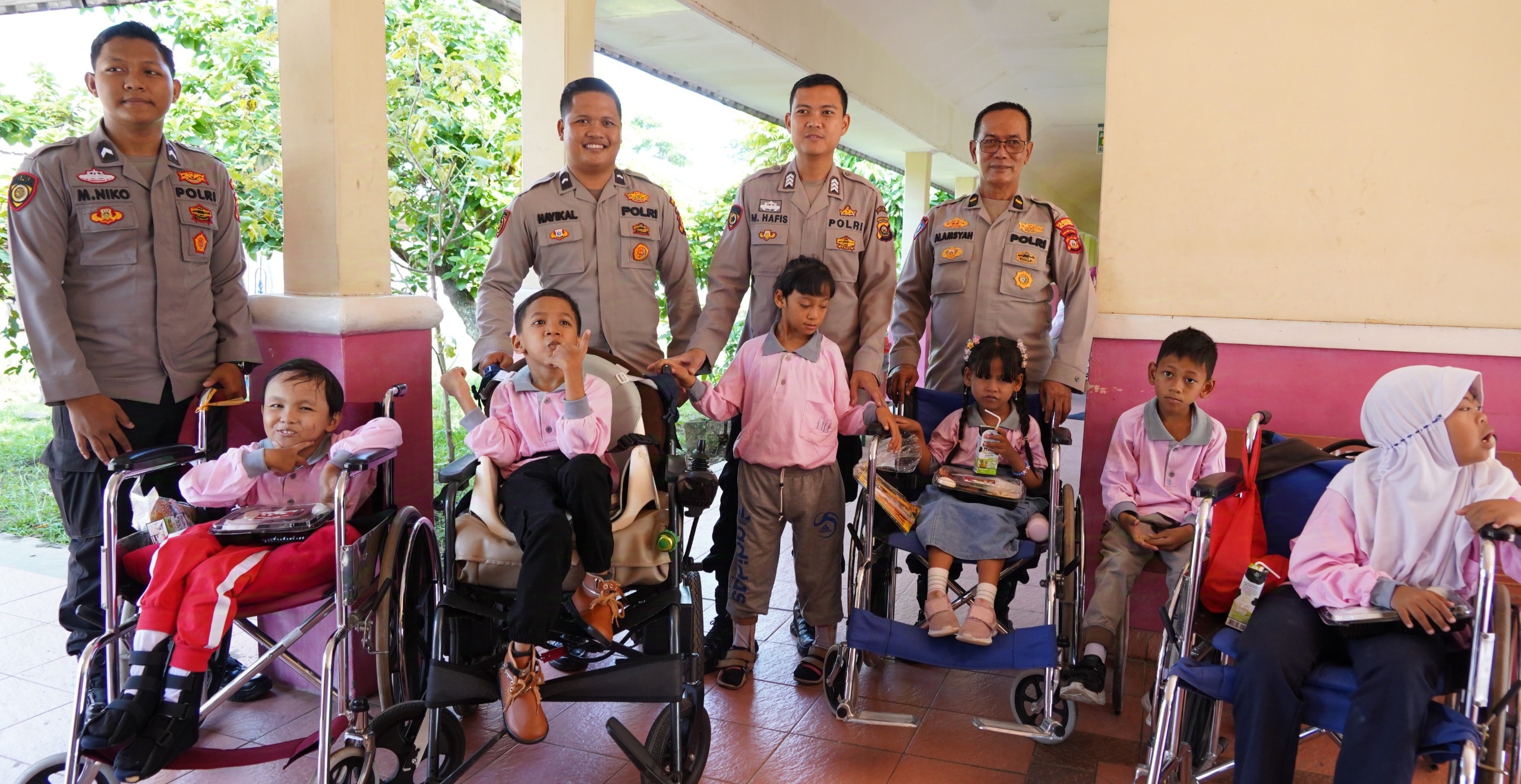 Siswa-siswi SLB YPAC menyambut dengan senyum ceria saat rombongan Karo SDM Polda Sumsel Kombes Pol Sudrajad Hariwibowo, SIK,MSI, Kabid TIK Polda Sumsel Kombes Pol Boyke Karrel Watimena,SIK,MH para kabag satker Ro SDM Polda Sumsel, Para Kasubbid Satker Bid TIK serta Personel Ro SDM dan Personel Bid TIK Polda Sumsel serta turut juga hadir Kapolsek Sako Kompol M, Aidil Fitri SH,MM bersama Personil Bhabinkamtibmas Polsek Sako Polrestabes Palembang memasuki sekolah dari kelas ke kelas, membagikan makan siang kepada para siswa.