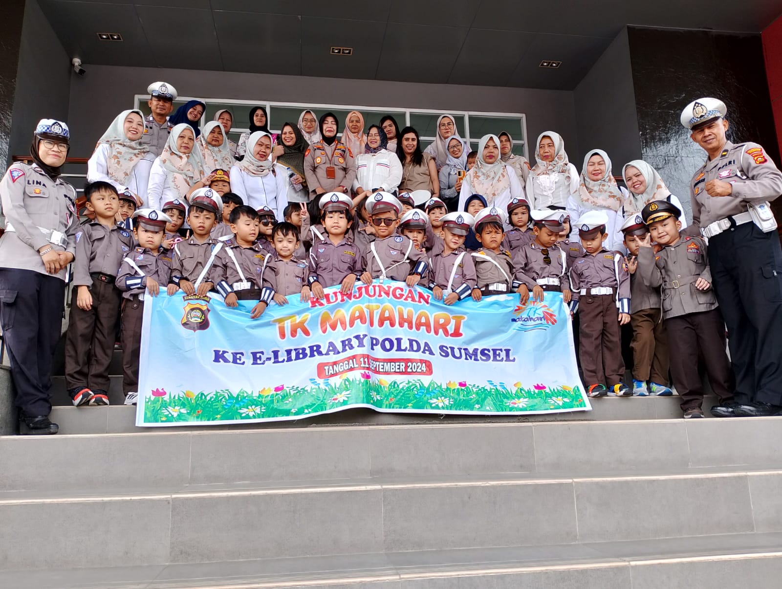 Palembang,- melakukan kunjungan anak anak TK Matahari Sumsel ke perpustakaan E-Library setum Polda Sumsel yang bertujuan untuk memperkenalkan perpustakaan kepada anak sejak usia dini, sekaligus untuk menumbuh kembangkan minat baca anak. Dalam rangka mengenalkan buku bacaan dan menarik minat baca pada anak usia dini. Berbagai layanan perpustakaan dikenalkan pada anak-anak agar mereka mengetahui manfaat dari fasilitas perpustakaan, ujar Kasetum Polda Sumsel AKBP Anna Susila,SE disela -sela menerima anak-anak TK Matahari Sumsel diruang E-Library Setum Polda Sumsel Rabu 12 September 2024