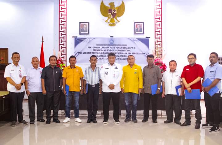 Bertempat di ruang serbaguna kantor Bupati Kepulauan Sangihe Rabu (3/06/2024), dilaksanakan acara penyerahan laporan hasil pemeriksaan BPK RI perwakilan Provinsi Sulawesi Utara atas laporan pertanggung jawaban penerimaan dan pengeluaran dana bantuan keuangan partai politik di kabupaten Kepulauan Sangihe. Acara tersebut dihadiri Pj Bupati Kepulauan Sangihe Albert Huppy Wounde, SH. MH, Pimpinan DPRD Kabupaten Kepulauan Sangihe yang diwakili oleh anggota DPRD Ferdy Panca Sinedu, ST, Sekretaris Daerah Kabupaten Kepulauan Sangihe Melancho Harry Wolff, ST ME serta para pengurus partai politik yaitu Perindo, Hanura, Berkarya, Golkar, PDIP, Gerindra, NasDem dan Demokrat.