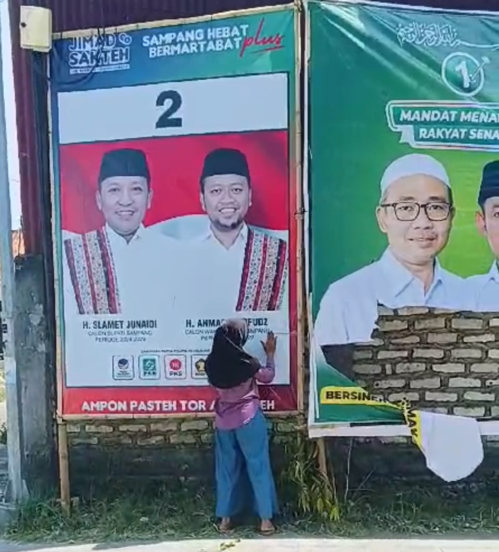 Viral di kabupaten Sampang seorang perempuan ditengah terik matahari sedang malakukan aktivitas yang tak biasa dan unik, pasalnya dalam rekaman video amatir warga sosok perempuan tersebut sedang memperbaiki salah satu baliho APK salah satu Paslon pilkada kabupaten Sampang 2024 yang sobek dibagian bawah kiri, dimana bagian yang nampak sobek tersebut mengenai nama salah satu calon wakil bupati Sampang KH. Ahmad Mahfud, Sabtu 12/10/2024.