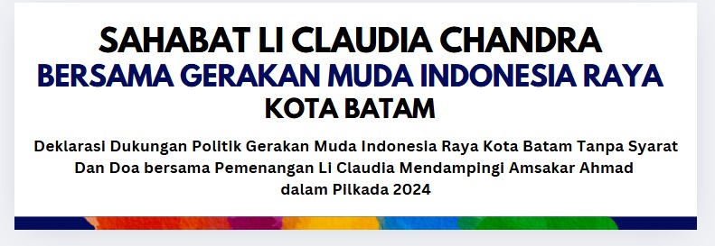 “Setelah melalui berbagai kajian dan pertimbangan serta melakukan pemantauan langsung tentang harapan kita sebagai masyarakat Batam, maka hari ini kita nyatakan secara terbuka bahwa kita bersama kawan-kawan aktivis gerakan Pemuda Kota Batam yang hadir menentukan sikap dan dukungan kita bersama kepada sosok Ibu Li Claudia Chandra sebagai Calon Wakil Walikota yang mendampingi Bapak Amsakar Ahmad sebagai Walikota Batam dalam kompetisi Pilkada Kota Batam 2024.