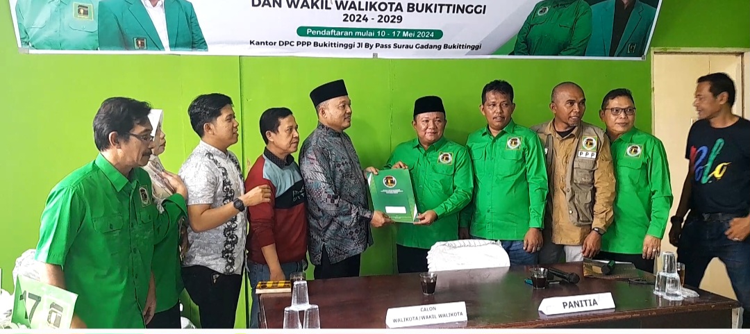 Heri Tito Rinaldi bersama rombongan tim sukses menyerahkan formulir pendaftaran sebagai Bakal Calon Wali Kota Bukittinggi ke Kantor Dewan Pimpinan Cabang Partai PPP Kota Bukittinggi, Senin, 13/05/24