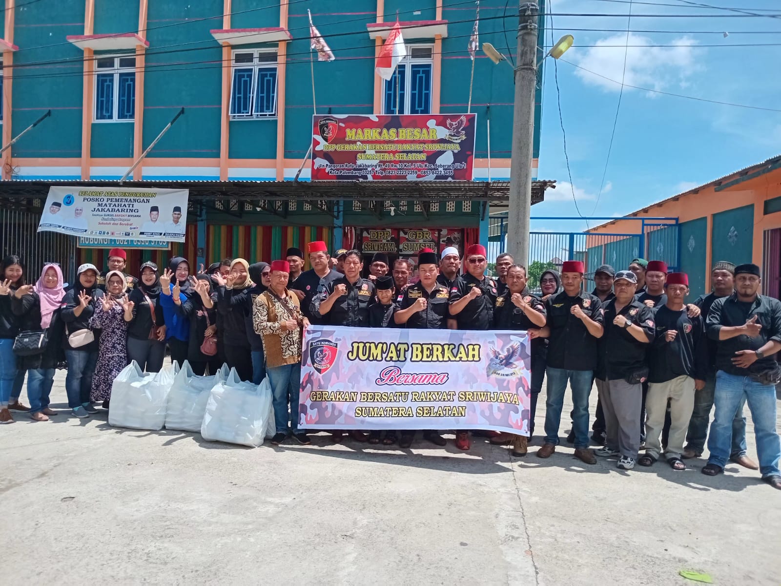 Palembang _ Puluhan anggota Dewan Pimpinan Pusat Gerakan Bersatu Rakyat (DPP GBR) Sriwijaya Sumatera Selatan (Sumsel) bagikan ratusan nasi kotak untuk kaum dhuafa. Termasuk juga pejalan kaki, tukang ojek dan warga sekitar yang melintas di Jalan Pangeran Ratu, Kecamatan SU.I, Jumat (09/11/2024).