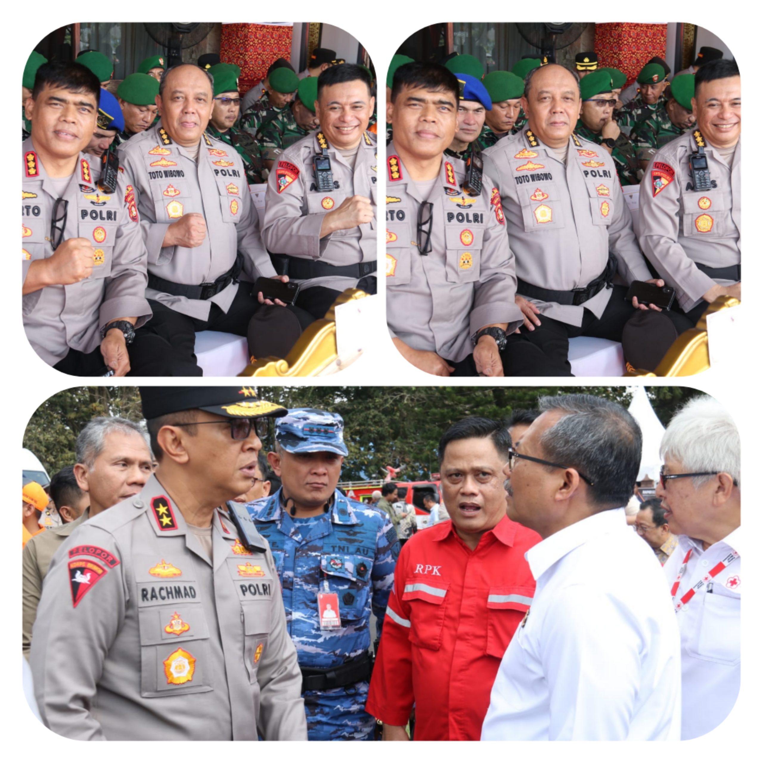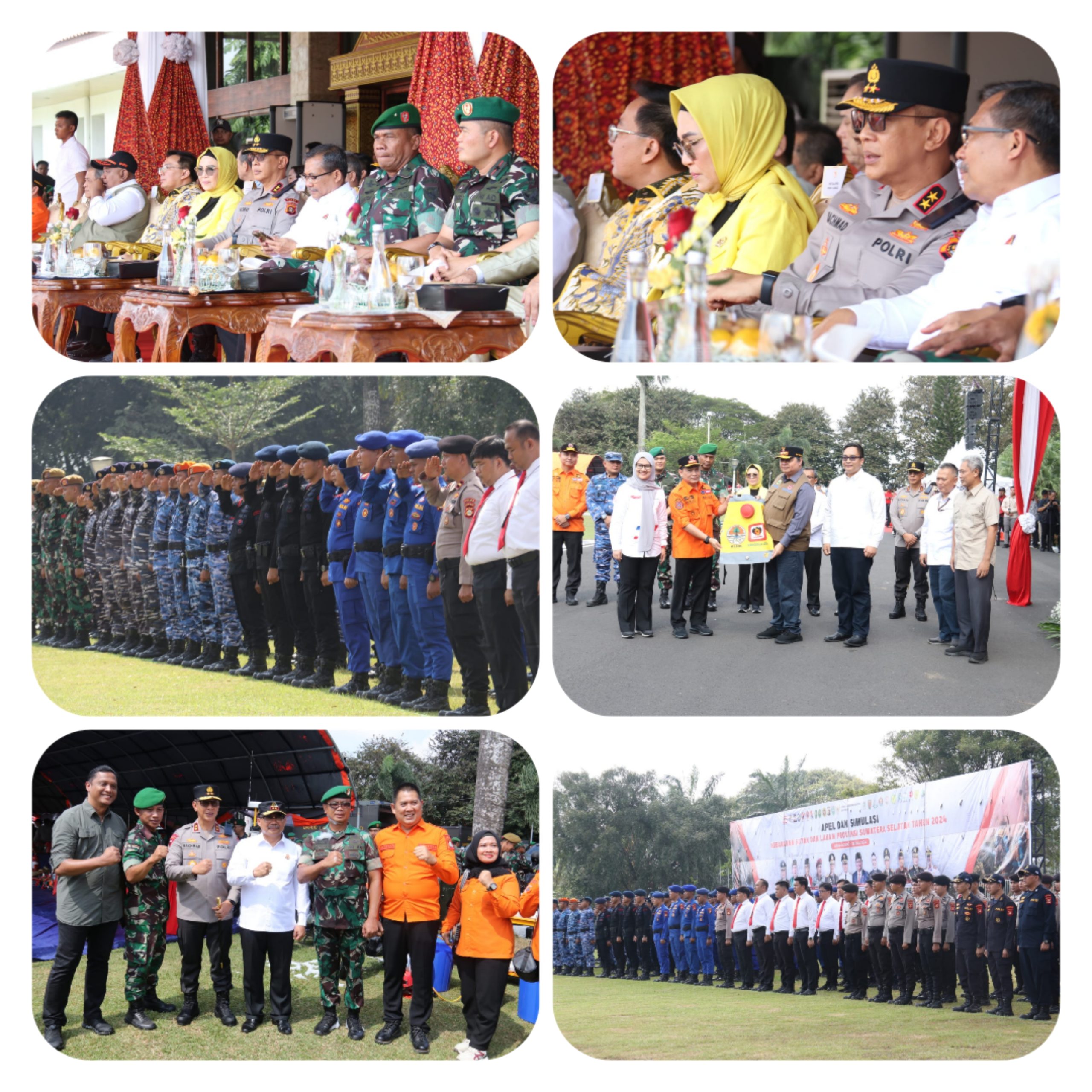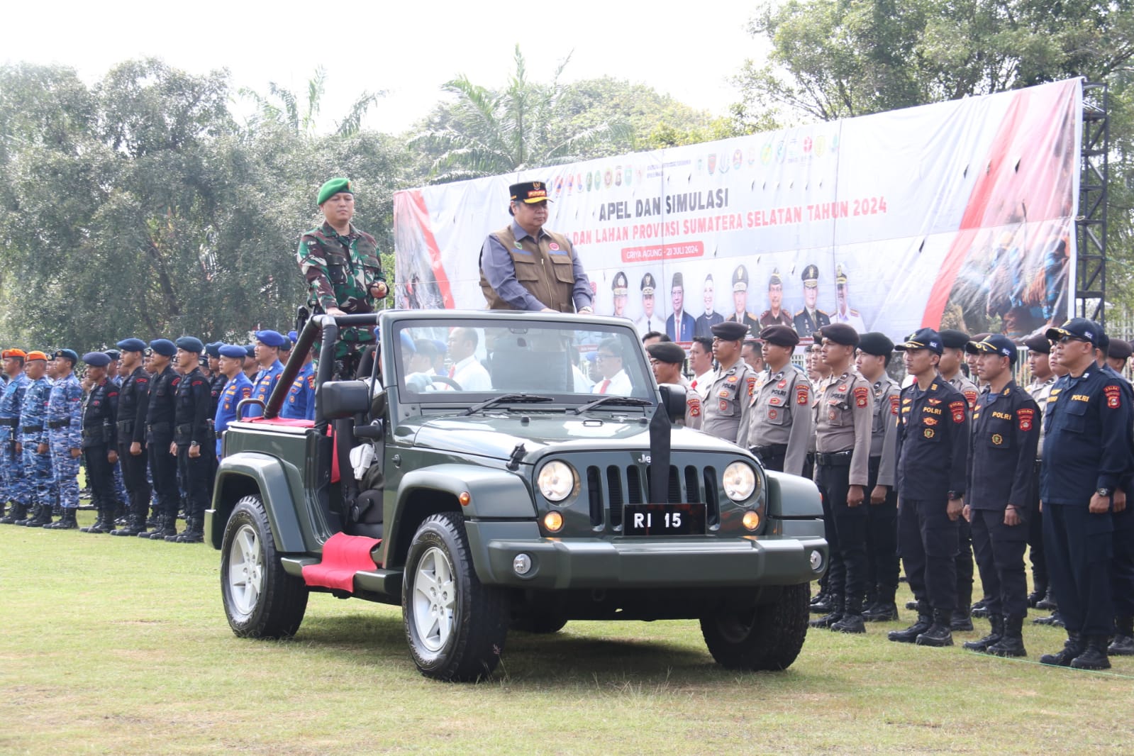 PALEMBANG,- Kapolda Sumsel Irjen Pol A. Rachmad Wibowo,SIK bersama Kasatwil jajaran dan Forkompimda Provinsi Sumsel serta instansi Terkait lainnya melaksanakan Apel Siaga dan Simulasi Penanggulangan Kebakaran Hutan dan Lahan (Karhutla) Provinsi Sumatera Selatan (Sumsel) Tahun 2024 digelar di halaman Griya Agung, Palembang, hari ini. Acara ini dipimpin langsung oleh Menteri Koordinator Bidang Perekonomian, Airlangga Hartarto, selaku inspektur upacara, Sabtu (20/07/24).