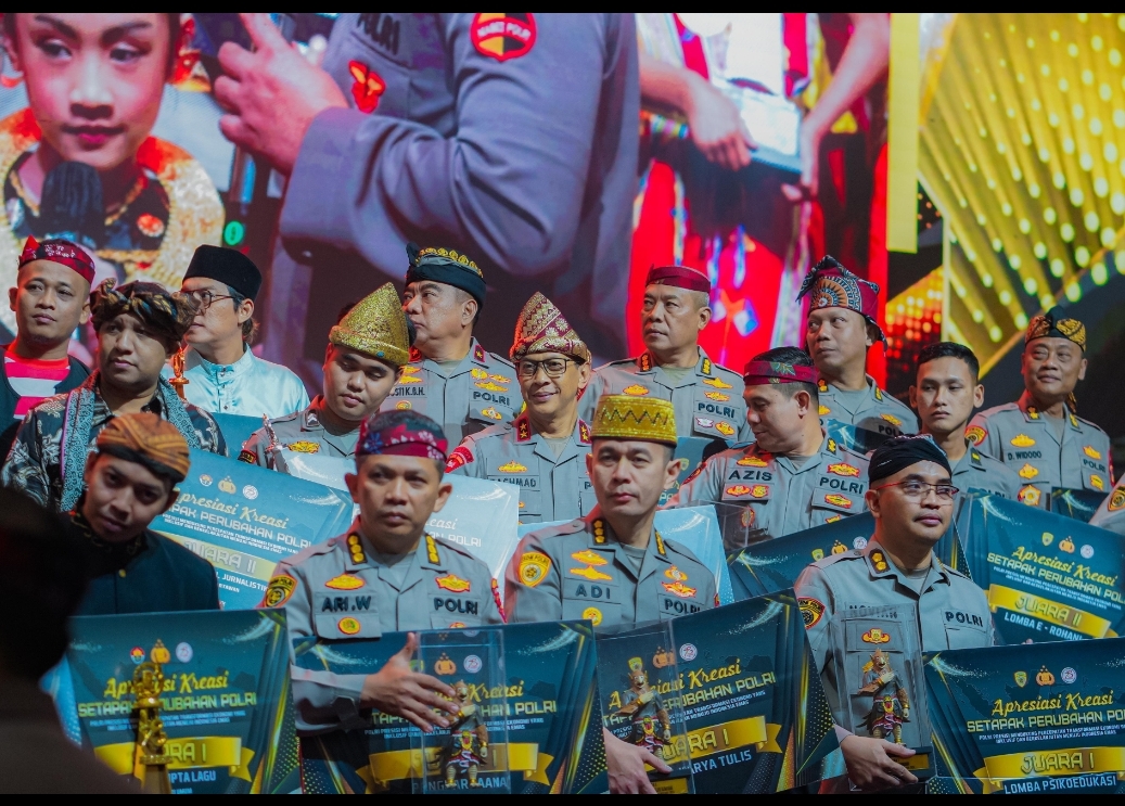 menghadiri acara malam apresiasi kreasi bertajuk ‘Setapak Perubahan Polri’ yang berlangsung di Gedung The Tribrata, Jakarta Selatan, pada Jumat malam (23/8/2024).