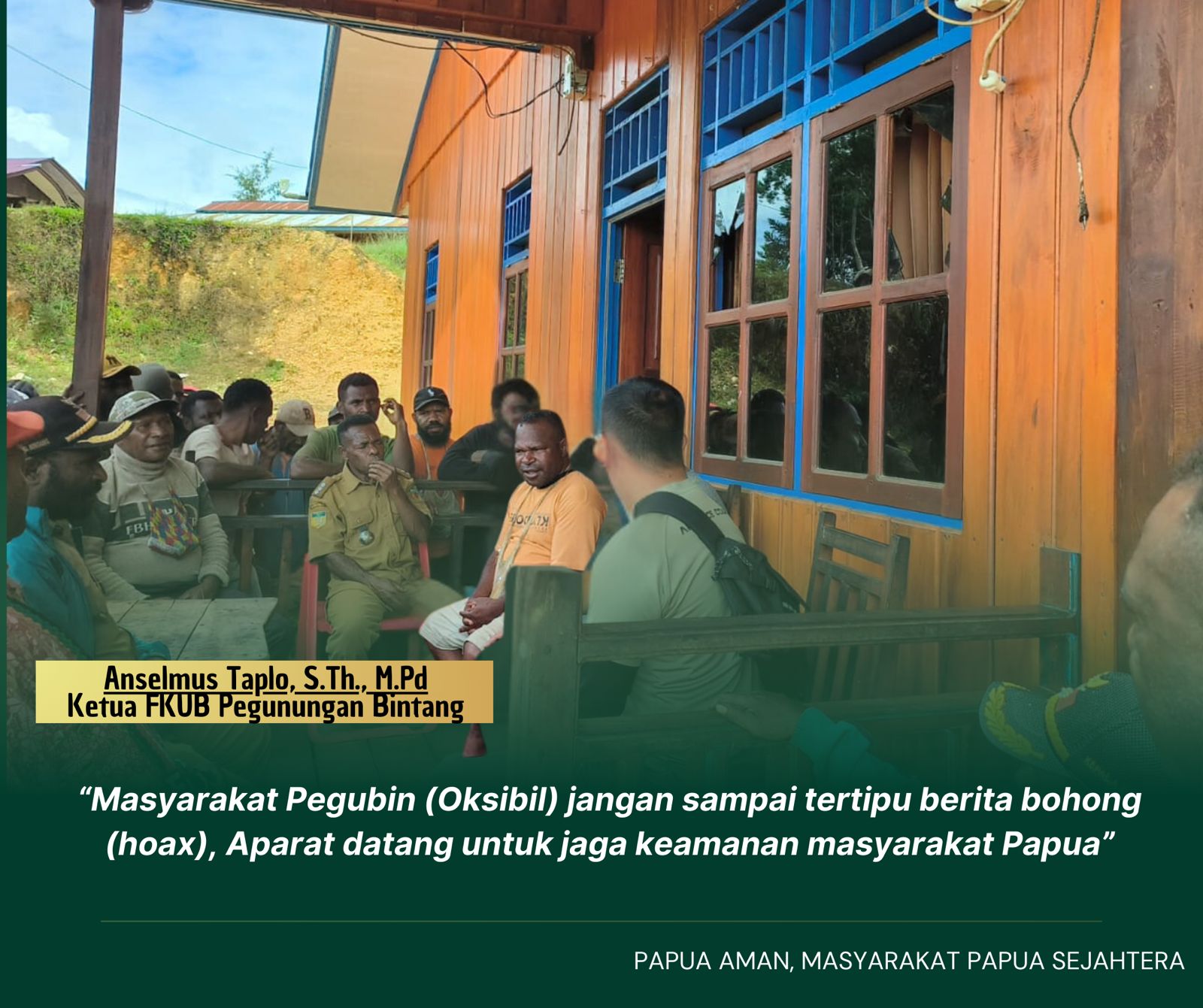 KOMPAS86.COM, Pegunungan Bintang – Ketua FKUB (Forum Kerukunan Umat Beragama) Anselmus Taplo, S.Th., M.PdK abupaten Pegunungan Bintang, mengatakan bahwa pihaknya saat ini sangat membutuhkan kehadiran peran Apkam TNI dan Polri di wilayahnya, untuk pembangunan fasilitas jalan raya di daerah tersebut. “Kehadiran Apkam di daerah sini bukan untuk mengancam keamanan dan mengusik warga disini, Apkam akan banyak membantu kita disini,” kata Anselmus Taplo, S.Th., M.Pd di Kampung Oksob, Kabupaten Pegunugan Bintang pada Senin (9/12/2024).