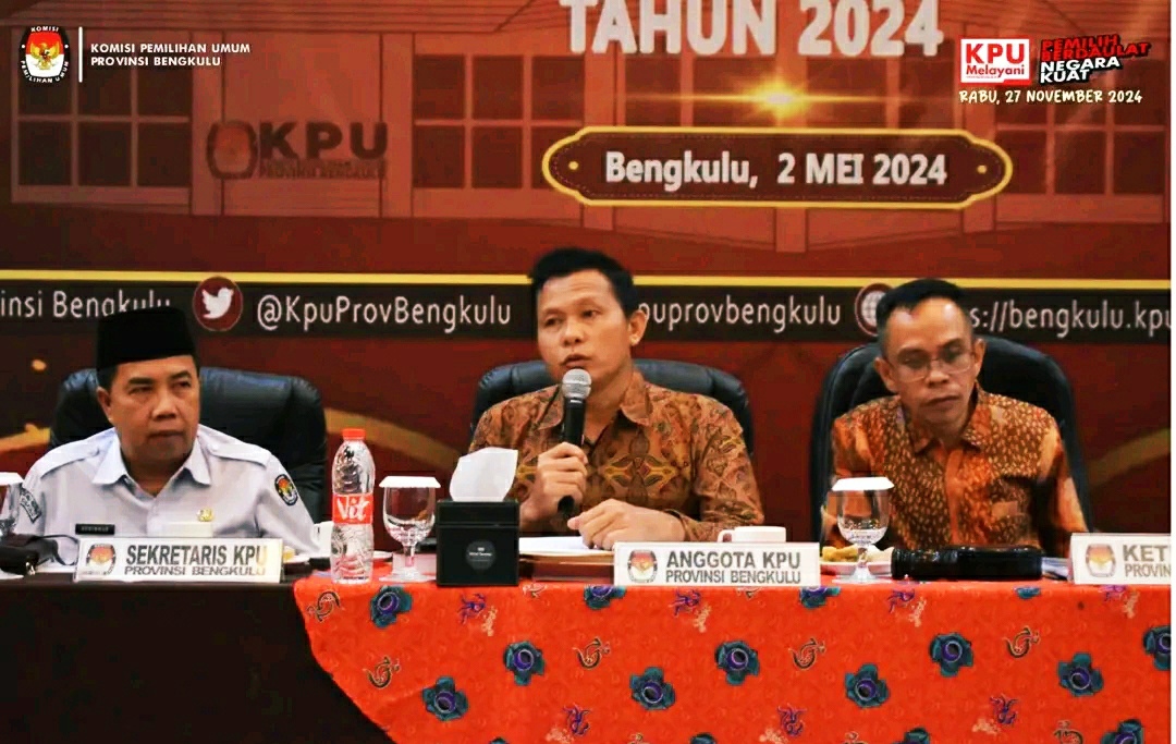 Kompas86.com Bengkulu-Ketua Komisi Pemilihan Umum (KPU) Provinsi Bengkulu gelar rapat pleno terbuka penetapan kursi dan penetapan calon terpilih anggota DPRD hasil pemilu sertak tahun 2024 di hotel santika (2/5/2024)