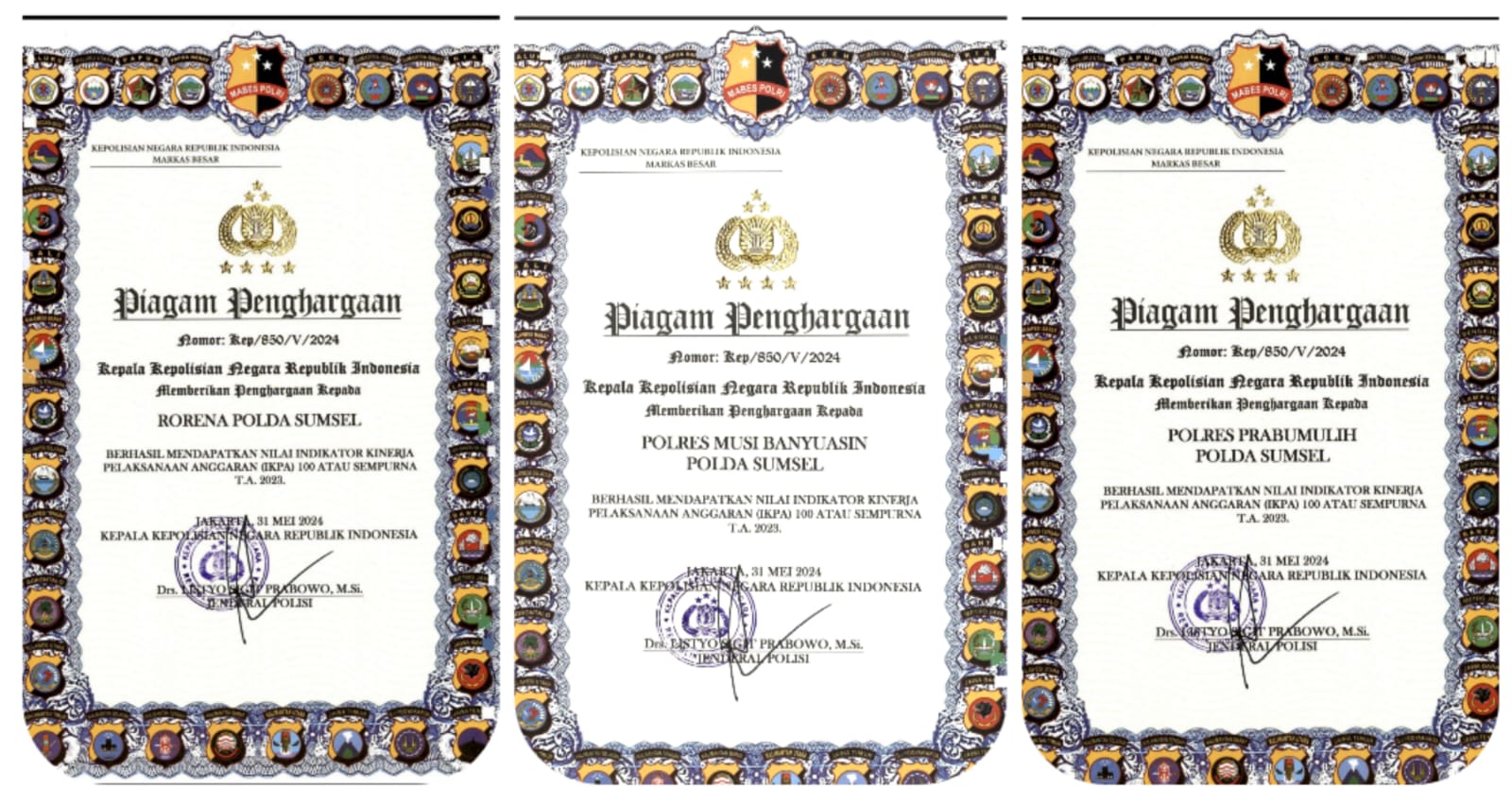 SEMARANG – Satuan Kerja (Satker) Biro Rena Polda Sumsel dan 2 Satuan Kewilayahan (Satwil) yakni Polres Prabumulih dan Polres Musi Banyuasin mencatatkan prestasi gemilang dibidang penyelenggaraan pengelolaan keuangan tahun anggaran 2023, mendapatkan piagam penghargaan Kapolri dengan kategori nilai IKPA (Indikator Kinerja Pelaksana Anggaran) Sempurna.