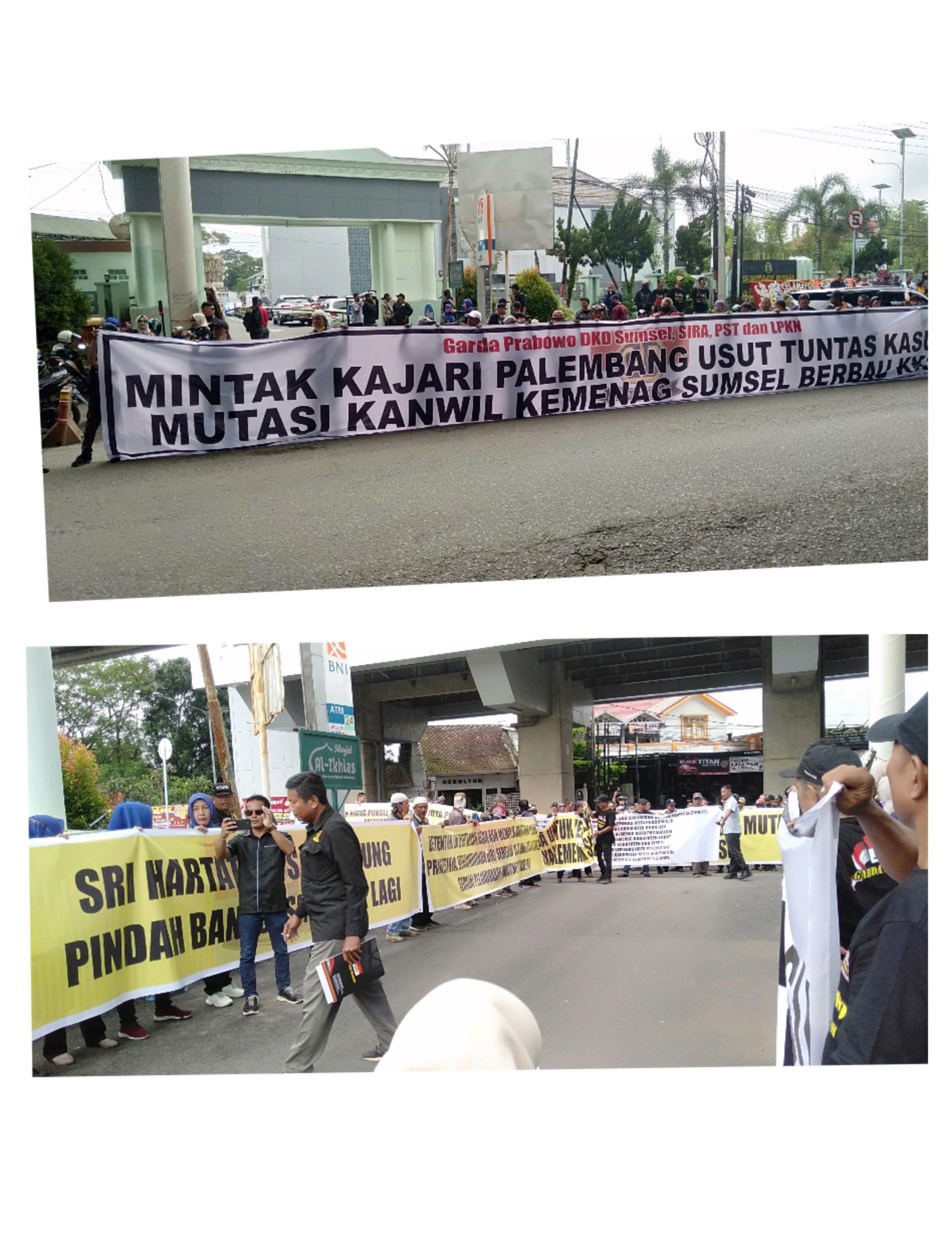 Palembang – Massa Garda Probowo DKD Provinsi Sumatera Selatan (Sumsel) sambangi Kejari Palembang terkait adanya dugaan penyalahgunaan wewenang serta jabatan dalam proses mutasi jabatan yang ada di Kanwil Kemenag Sumsel yang diduga dalam proses tersebut adanya dugaan nepotisme serta transaksional/tindakan jual beli jabatan.