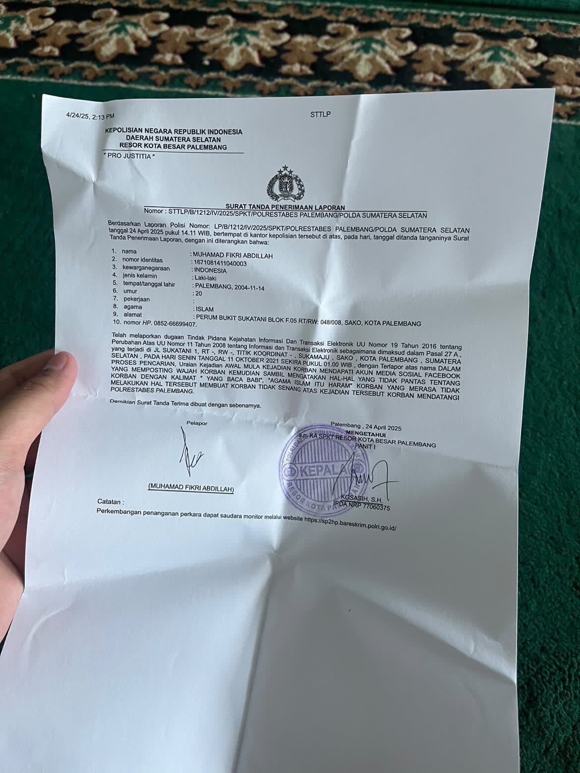 Palembang, 27 Juni 2025 – Muhammad Fikri Abdillah resmi melaporkan dugaan kasus pencemaran nama baik yang dialaminya ke Polrestabes Palembang, pada Senin (16/06).