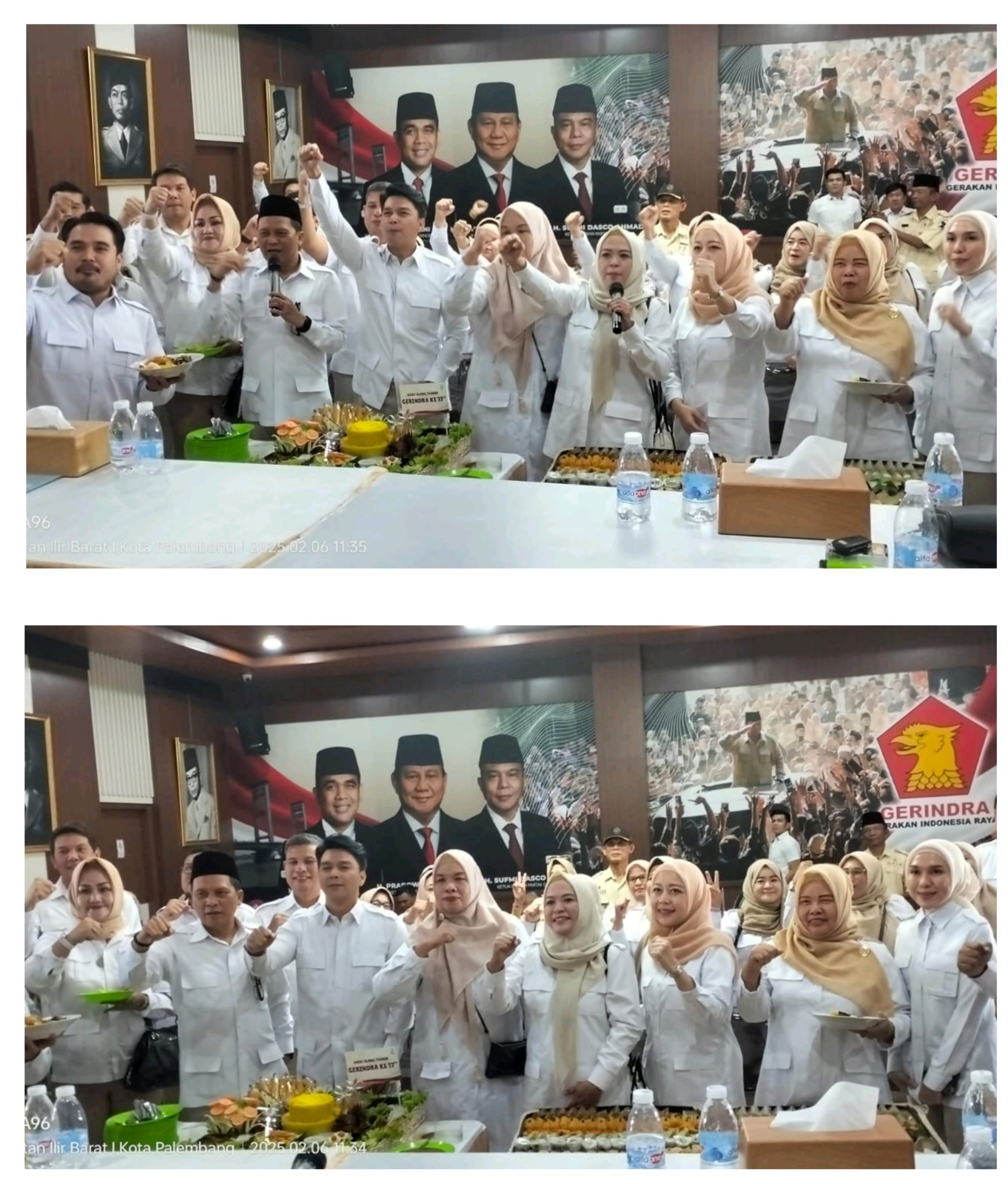 DPD Partai Gerindra Provinsi Sumatera Selatan menggelar syukuran Peringatan HUT Partai Gerindra ke 17 di tahun 2025 bertempat di Sekretariat DPD GERINDRA SUMSEL Jl. Soekarno Hatta kel Demang Lebar Daun Palembang, Kamis (6/2/2025). Syukuran HUT GERINDRA ke 17 ditandai dengan tumpengan dan dihadiri Pengurus DPD Partai GERINDRA SUMSEL, Dewan Penasehat DPD Partai GERINDRA SUMSEL, Fraksi GERINDRA DPRD SUMSEL, PD PPIR Provinsi Sumsel, PD Pira Provinsi Sumsel, PD SATRIA Provinsi Sumsel, PD Tidar Provinsi Sumsel, Badan KESIRA Provinsi Sumsel, PD Gemira Provinsi Sumsel, PD Gerakan Pekerja Buruh Indonesia Raya (GPBI) dan Jaringan Rakyat Indonesia RAYA (JARI RAYA).