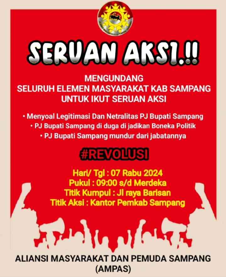 Sampang||kompas86.com– Media sosial perpesanan diramaikan dengan edaran Flyer seruan aksi yang mengatasnamakan AMPAS(Aliansi Masyarakat Dan Pemuda Sampang), Dalam flyer yang beredar seruan aksi Mengundang elemen masyarakat Kabupaten Sampang dimana menyebutkan, aksi itu akan dilakukan pada Rabu 07 Febriari 2024 Hari ini.